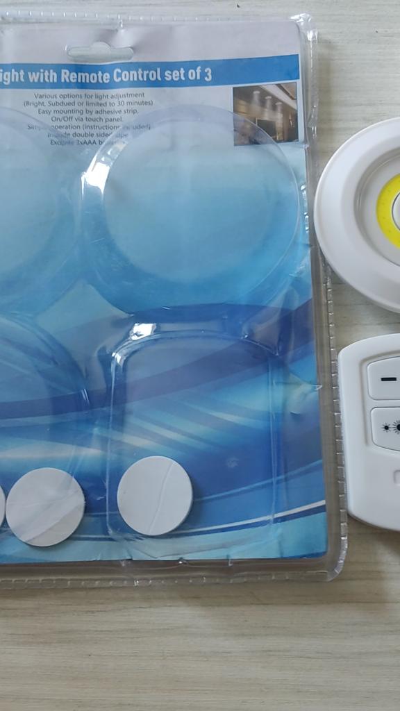 Все пришло в полном комплекте: сами светильники, пульт, держала для него, и даже двойной скотч чтоб крепить на поверхность. Распаковала, вставила батарейки - все работает.