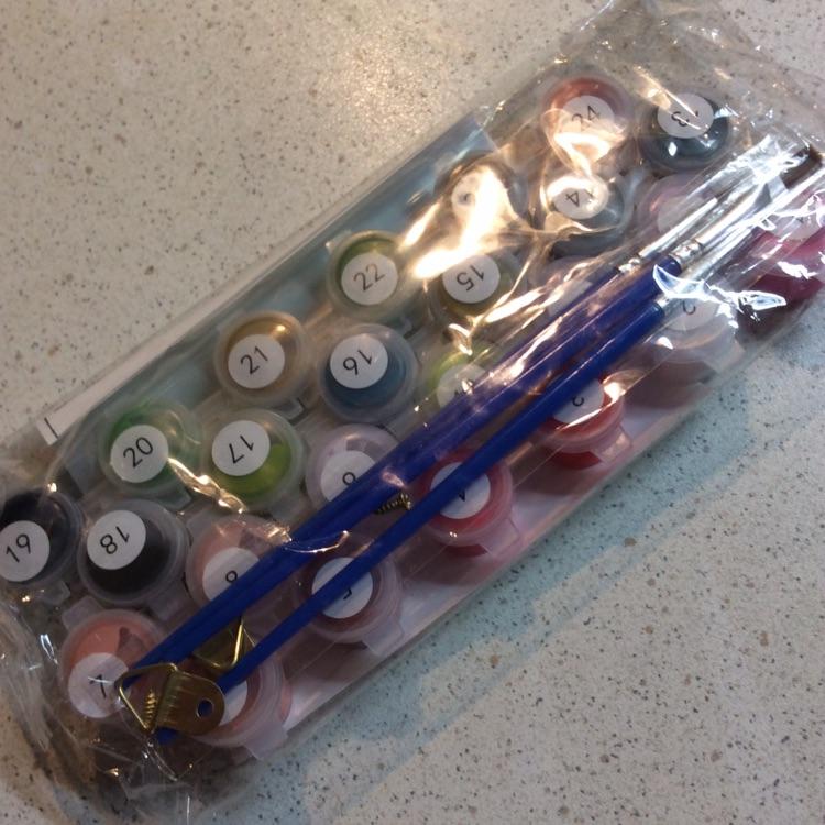 Размер соответствует описанию. 24 цвета краски, 3 кисточки, 2 подвеса с шурупчиками. Полотно накручено на пенопластовый валик, ничего не помялось. Спасибо, супер картина