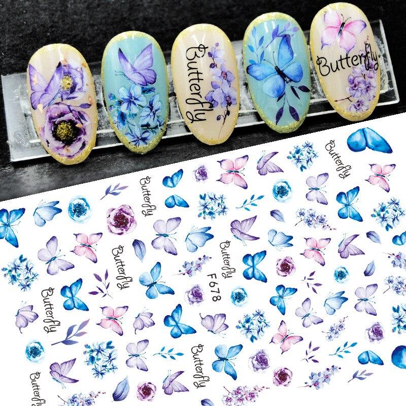 Наклейки для ногтей с бабочками, наклейки для ногтей, цветочные синие красочные клейкие татуировки для маникюра, слайдер для дизайна ногтей, декор