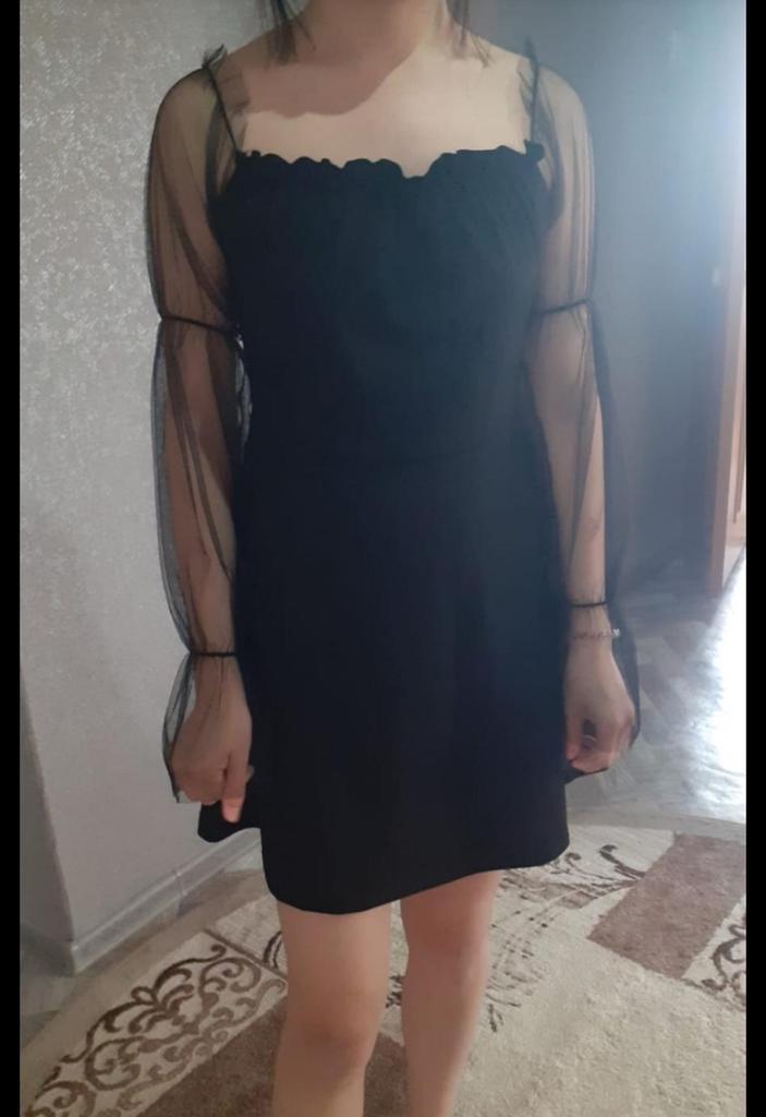 Маленькое чёрное 🖤 платье из плотной ткани, спереди вырез на резиночке оформлен, рукава из тонкой газовой воздушной ткани можно приопустить с плеч. Короткое!!!