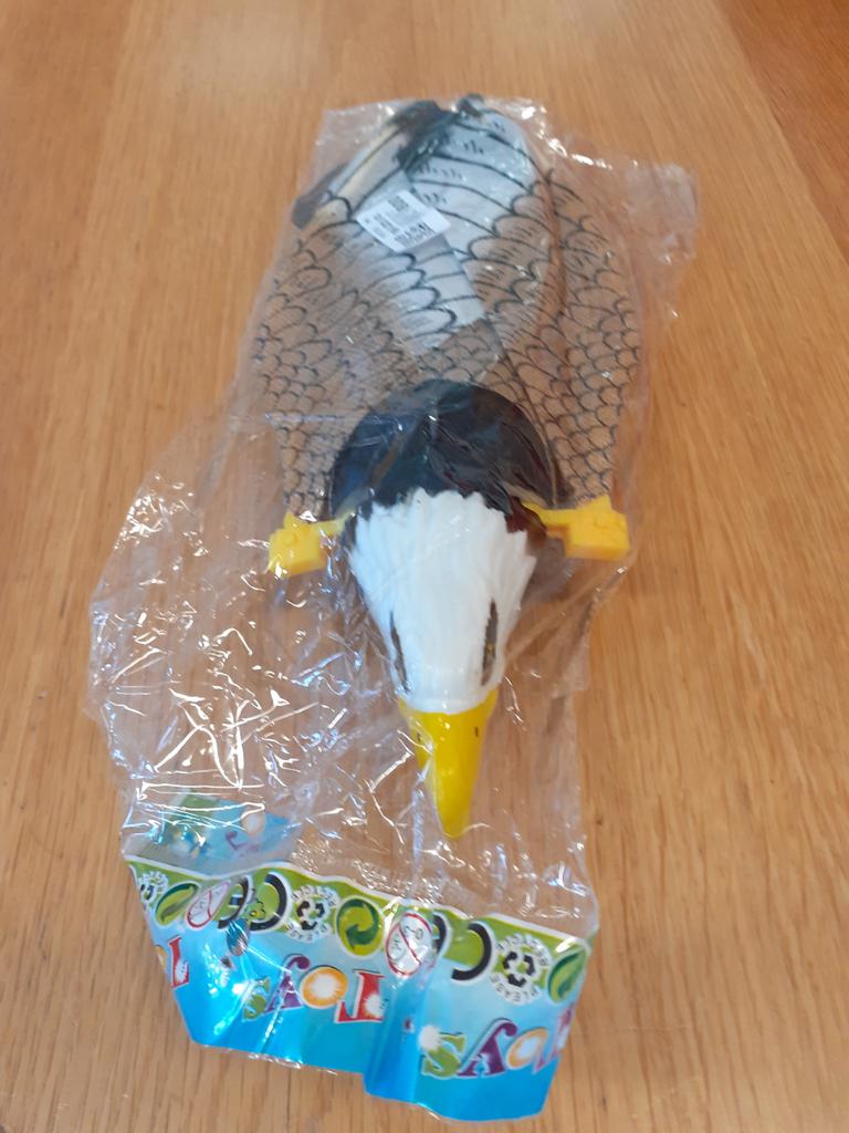 Заказ отправила 19.05.23 Получила в почтовом терминале 15.06.33 До Эстонии заказ шел 28 дней, это быстро! Это отпугиватель птиц в виде летающего орла. Нужно вставить 2 батарейки АА, в комплект не входят. По описанию должны загореться глаза и долден летать. Сам орел изготовлен из пластика, крылья из ткани. Купила для подарка племяннику на день рождения, у него свой дом с садом. Соберет попробуем,как он будет гонять птиц, тогда вышлю фото. Продавцу и службе доставки 5+