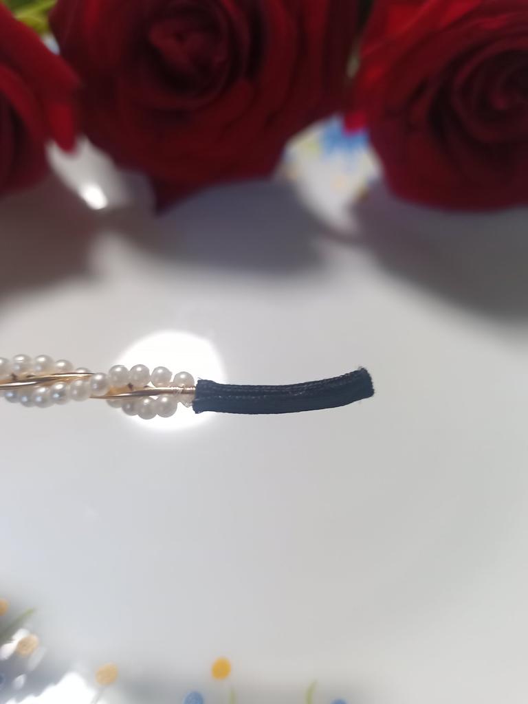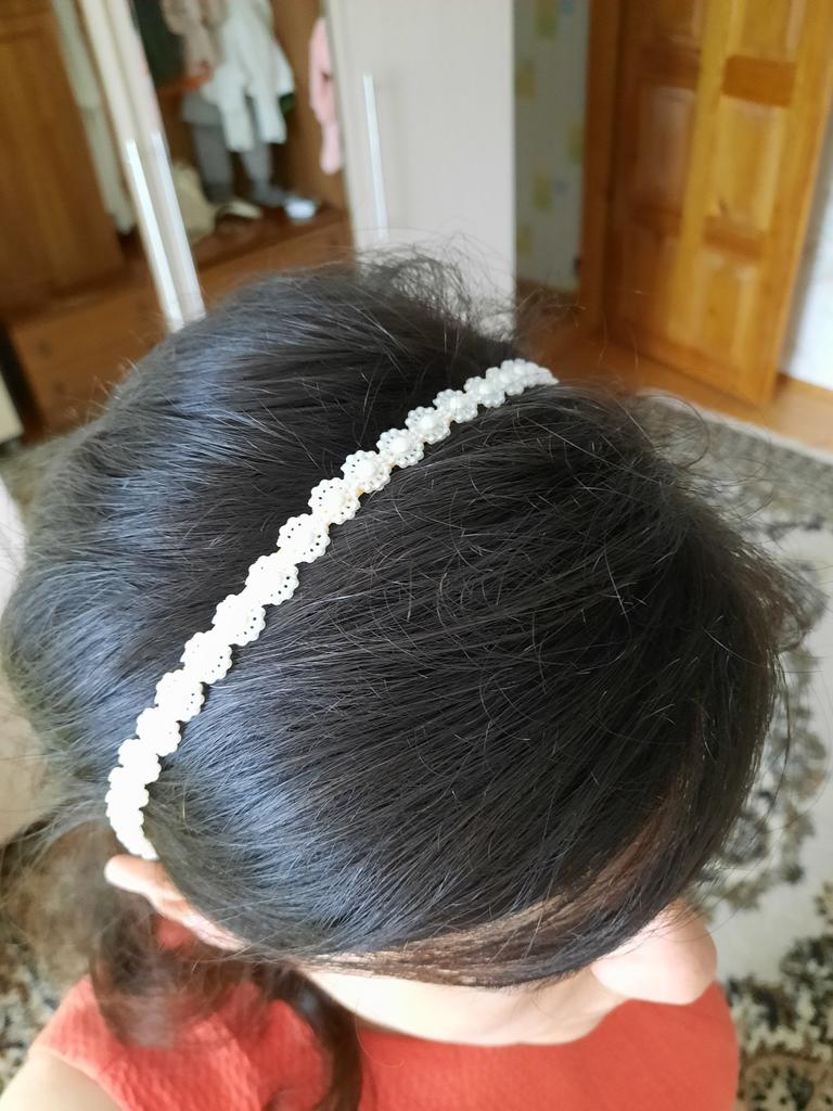 Обруч милый, симпатичный. Бусинки-цветочки приклеены плюс закреплены леской дополнительно по спирали. Издалека, если не присматриваться близко, это не заметно. На концах обруча надеты тканевые накладочки, чтоб не пережимало и не натирало голову. Сам обруч лёгкий, на голове почти не ощущается. Для удержания волос не подойдёт, только для украшения.