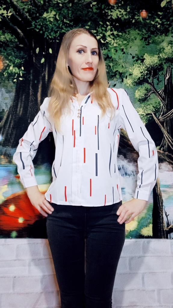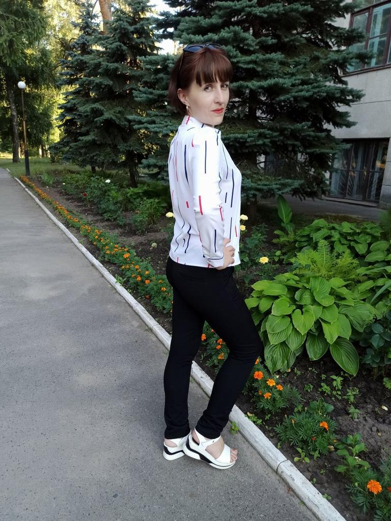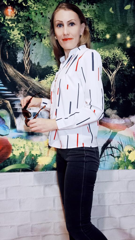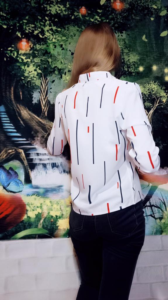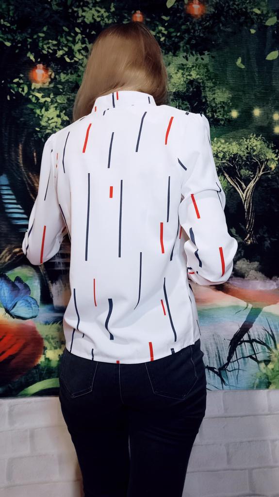 Всем привет! 👋🏼 Прежде чем я начну свой новый обзор, я пожелаю всем вам прекрасной рабочей недели! 💋 А тем, кто отдыхает желаю ярких и теплых деньков! ☀️ А у меня сегодня обзор начинается с шикарной блузки. 🙂 Если вы загляните в мой гардероб, то всегда найдете там хоть одну блузку. 🥴 Я не люблю слишком классические блузки, потому, что они у меня ассоциируются с образованием – школой. 🤪 Поэтому в моем шкафу если и есть белые блузки, то они точно будут с каким-то рисунком или дополнением. Эта блузка не просто белая, а дополнена геометрическими рисунками. Черные полосы идут в ассиметричном порядке, поэтому блузка выглядит не слишком правильной, но притягивающей наше внимание. Блузка не имеет вертикальной полосы из пуговиц, но у нее есть интересная деталь. Будто бы по блузке идет продолжение воротника поверх ткани. Но сверху, чуть ниже воротника присутствуют три пуговицы, они идут чисто для красоты. Блузка надевается через голову. С этой блузкой фигура немного вытягивается. В ней приятно находиться, ткань на ощупь мягкая и тонкая. Блузка пришла с биркой и этикеткой. На выбор у продавца 3 разные расцветки. На мне блузка в размере М. Она мне подошла, но думаю, что стоило мне взять на размер побольше. Все-таки мне показалась она немного короткой и чуть узкой в плечах. 🔅Мои параметры: Рост 165 см ОГ – 80 см ОТ – 65 см Ширина плеч 40 см 🔅Замеры блузки: ОГ – 92 см ОТ – 88 см Длина 56 см Ширина плеч – 35 см ❤️ Все равно блузка на мне сидит хорошо, и особо дискомфорта я в ней не испытываю. Советую, блузка хорошая. 🚚 Доставка до Москвы 3 недели.