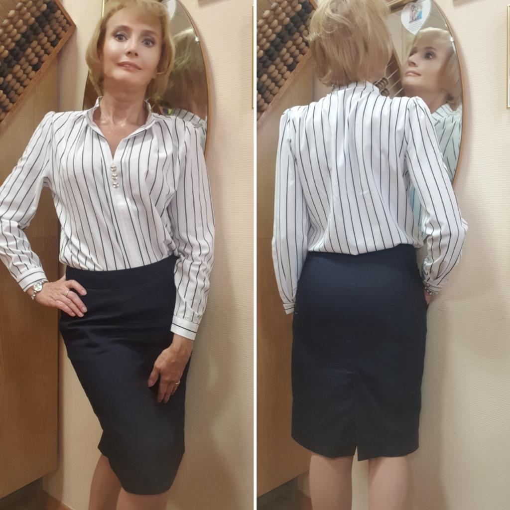 Эффектная офисная блузка Для офиса выбрала себе очередную блузку с элегантным воротником-стойкой, но не стандартную белую, а в полоску. На мои параметры 84×62×88, рост 150 см размер М идеально подошел: блузка сидит свободно, как и должна (не в обтяг). Рукава - 52 см для меня полной длины, но следует учитывать рост, на высоких будет коротко. Рукава с небольшими защипами на плечах и манжетами, застегивающимися на пуговицы. Сама блузки имеет имитацию застежка, но одевается через голову. Материал - полиэстер, нежный, легкий и струящийся. Ткань гладкая и плотная, зацепками от каждого чиха не покрывается. Несмотря на то, что ткань довольно тонкая, она не прозрачная. Но надеваю базовое гладкое белье (без гипюра), телесного цвета, чтобы быть уверенной, что на солнышке не просветит. Продавец предлагает три геометрические расцветки, все мне очень нравятся - выглядит изысканно и элегантно. Эта блузка меня привлекла красивым воротником-стойкой, в сочетании с нежным материалом блузки он выглядит изящно и строго, подчеркивает строгий офисный стиль. Общее качество пошива хорошее, швы обработаны оверлогом. Эту блузку можно назвать классической, поэтому она отлично вливается в стандартные повседневные образы: как со строгим костюмом, так и с классическими брюками/джинсами. Хорошо блузка сочетается и со строгой юбкой-карандаш, и с шелковистыми юбками ниже колена. Блузку с удовольствием рекомендую! Цена на момент публикации 591₽. Доставка до Москвы два месяца с отслеживанием до почтового отделения совместно с другими товарами. Для более выгодной покупки используйте промокод на скидку 5% на любые товары joom: XITC4VR26O. Скопируйте, пока он красный. После активации промокод действителен еще три дня. Telegram-канал: tb_1970_kanal