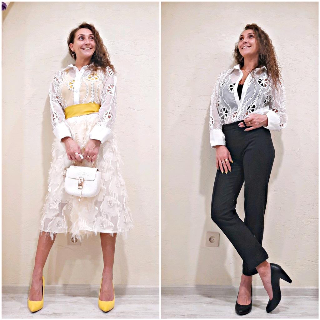 Оригинальная рубашка на лето Легкая, воздушная, нежная! В жизни я конечно буду носить её поверх топа! Можно с топом телесного цвета, да и с любым другим, мне нравится с чёрным. Идёт в одном размере. Подойдет на 42-46 точно. Может и на 48, но не уверена. Мои параметры ОГ 92 плечи 40, рост 172см.
