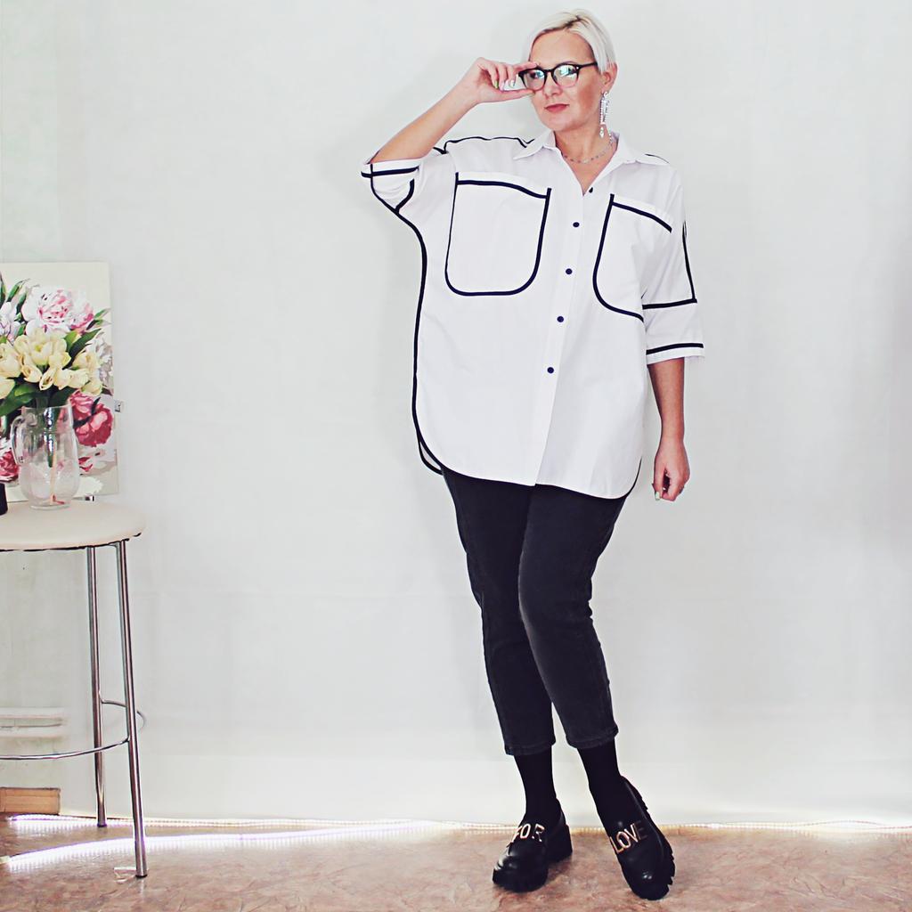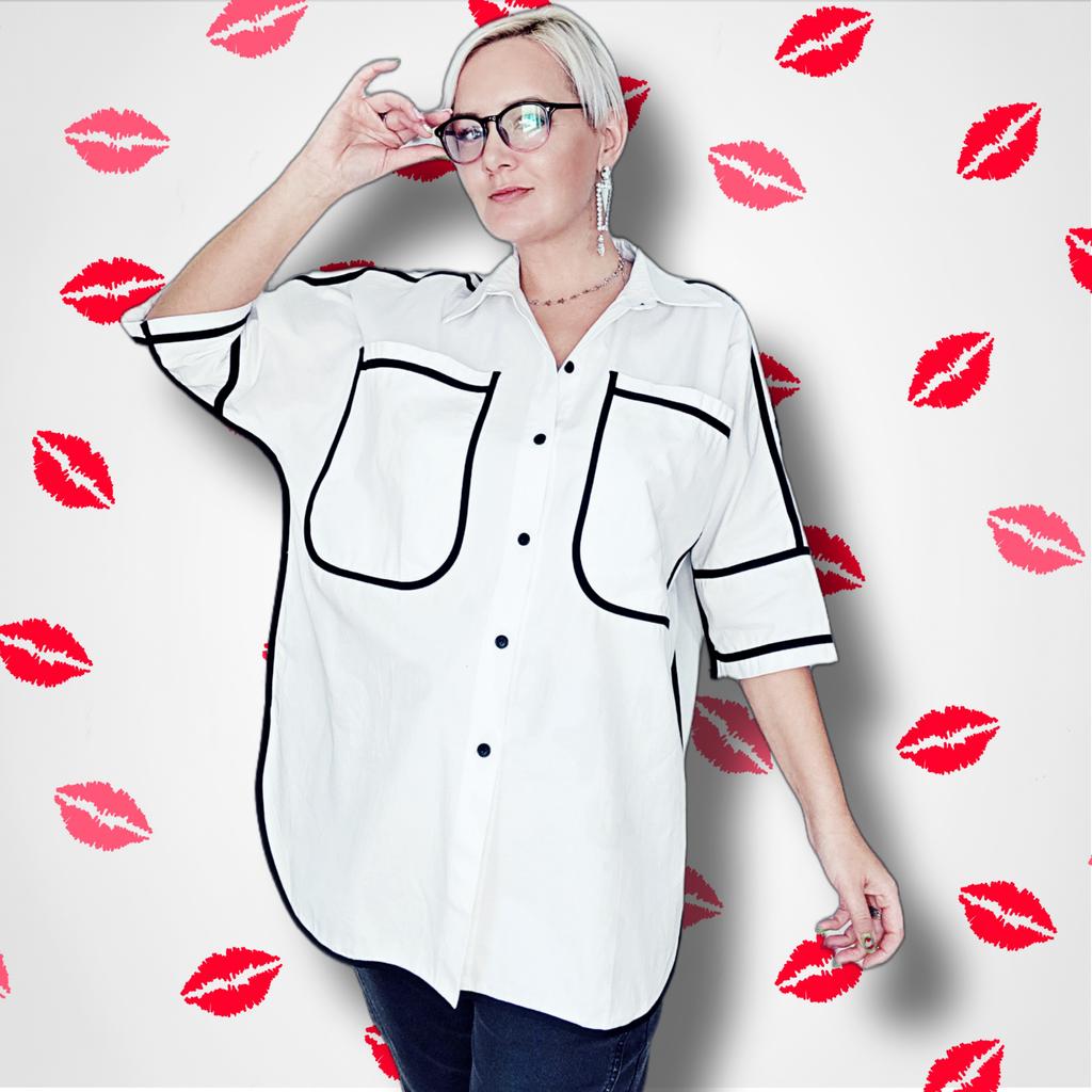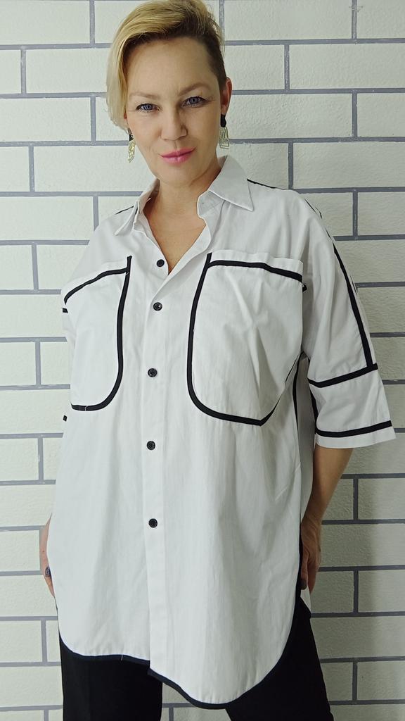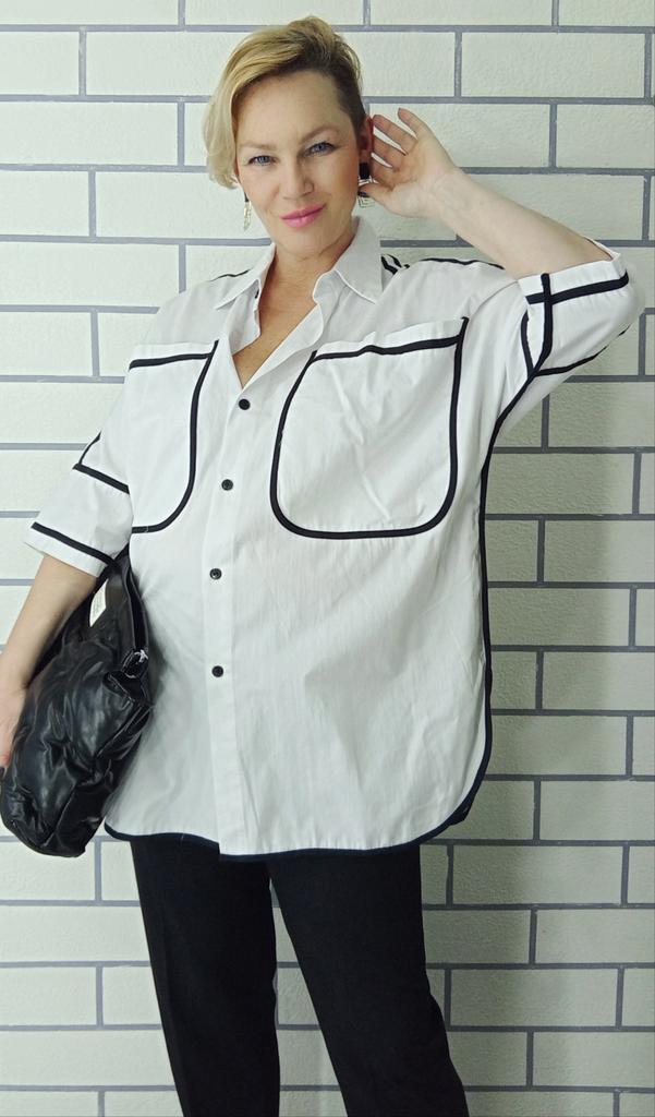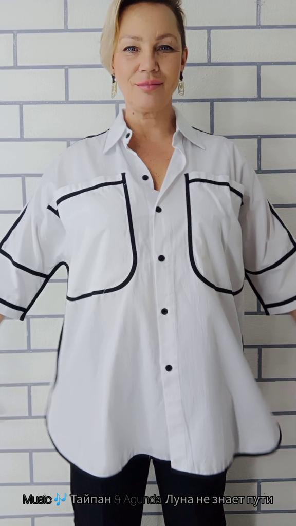 Сложный чёрно- белый от DIMANAF 😍. Рубашка интересного дизайна с накладными карманами. Действительно яркая и стильная. Белоснежный цвет с кантрастной черной оторочкой. Черные лампасы выпуклые, расположены по периметру всей рубашки: на рукавах, карманах и боках. Карманы объёмные. Рукава цельнокройные, по типу "летучая мышь". Материал плотный хлопок, с небольшой долей полиэстера. В описании значится полиэстер, и этого не может быть, потому как и визуально, и тактильно ткань натуральная. Мнется, как и положено хлопку. Модель оверсайз, и чем свободнее сядет рубашка, тем лучше. И носить ее можно как кардиган: с брюками, юбками и платьями. Размерный ряд М-2xl. На мне L. Замеры: ОГ 122. Длина 80. Ширина рукава в узкой части 34. Мой рост 167, параметры 98-84-100. Вещь смелая, неординарная, на любителя. Пошив фабричный, есть бирки и этикетки. Пакет фирменный. Конечно, рекомендую, а как же иначе?
