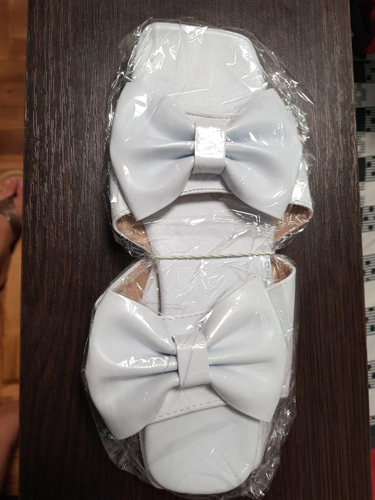 Шлепки хороши, а белые так вообще по-дорогому смотрятся, заказала 39 размер на стопу 38 размера. Сидят замечательно. Думала, что подошва резиновая, но нет, да и ладно. Из минусов только разве что то, что бантики относительно друг друга приклеены чуть кривовато, но это не страшно. Берите размер в размер, если у вас очень узкая стопа, но если стопа средней ширины, а уж тем более пошире, то берите на размер больше. Шлепки - вечная классика, ничего лишнего, и со вкусом. Рекомендую к покупке.