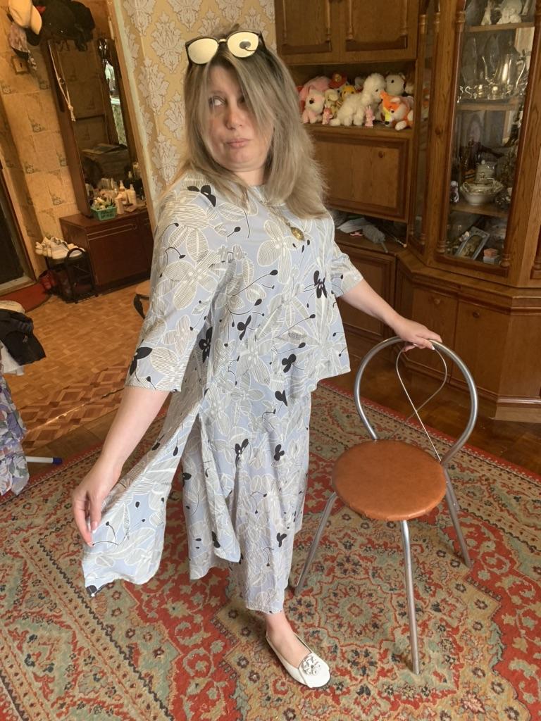 DIMANAF= любовь)). И снова попадание в яблочко, и снова восторг и розовые сопли)). Шопоголик, чо)) люблю красивую и качественную одежду. Спасибо Джум за уникальную возможность покупать часто и много без ощутимой дыры в бюджете)), могу сказать, что подобный костюм в московском шоу-руме я видела за 12 тысяч рублей. Ужас)). Дамы, это хлопок. Довольно плотный, не тянется, и не просвечивает. Такой, знаете, чуть жатый. Размер единый. Мой рост 167, параметры 100-88-104. Костюм сидит свободно, я фанат оверсайза, поэтому мне чем больше, тем лучше). Блуза без выточек, под грудью отрезная, хвосты по бокам можно завязать. Брюки- палаццо. На талии широкая резинка. Глубокие боковые карманы. У продавца есть другие расцветки, более яркие, я не осмелилась, хотя видела отзыв милой Леночки Николас, она взяла черный: очень динамично. Но мой цвет мне нравится бесконечно, я люблю синий и все ого оттенки (пятьдесят оттенков синего)). Этот , скорее, ближе к серому. А вообще, у меня путаница с нюансами цветов, возможно, я дальтоник). В общем и целом, я советую однозначно, заказывайте! Сейчас , в честь дня рождения Джум цена очень привлекательная!