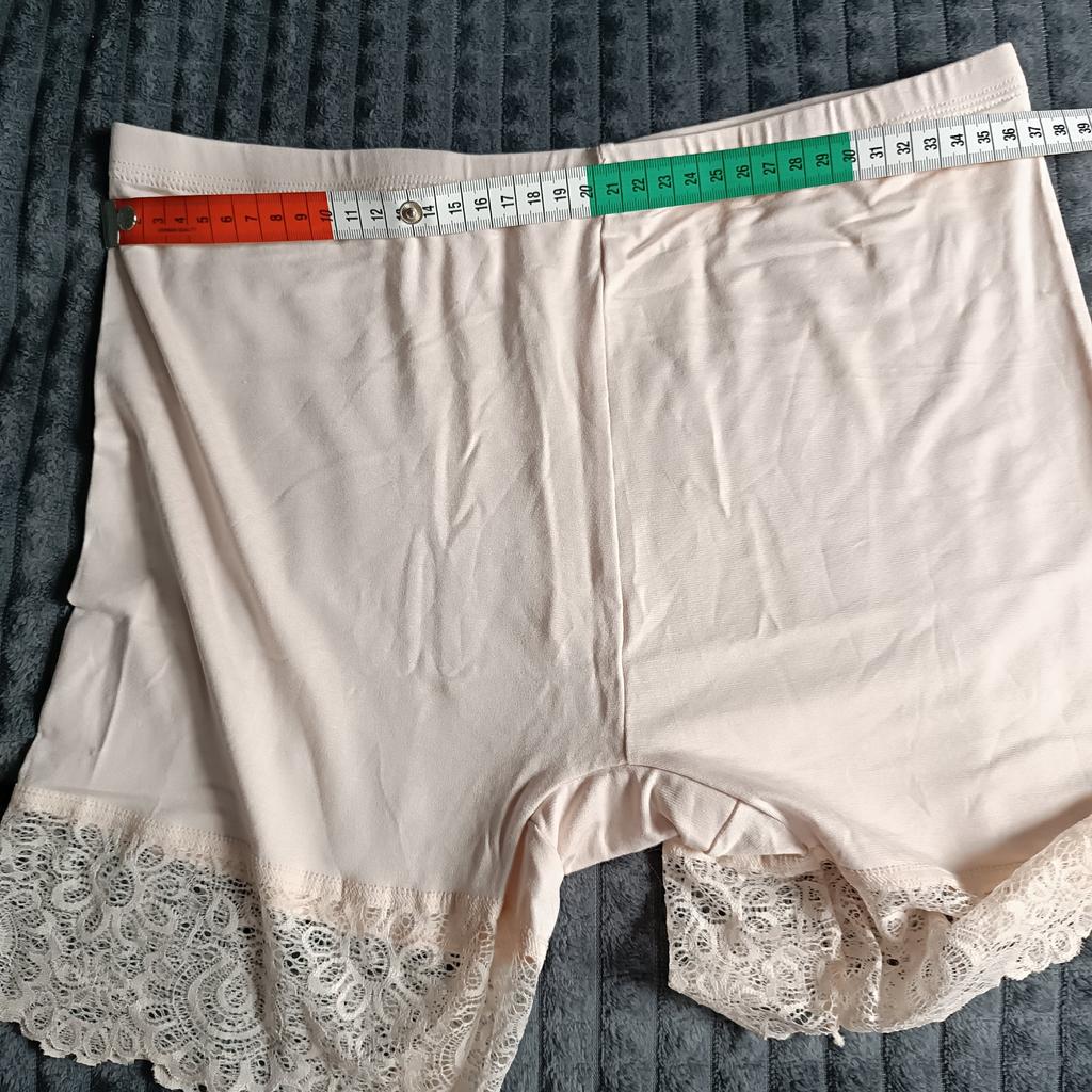 Неудачная покупка, трусы носить невозможно. Очень неудачное лекало. Они мне не малы, но крутила и так и эдак, где перед где зад непонятно. Как их не надень спереди почти до груди, а сзади не дотягивают до талии. К тому же на промофото трусы длинные, в реальности трусы заканчиваются там, где у модели с промофото начинается кружево. Швы внутри очень грубые, нормальное бельё так не шьют. Качество явно не фабричное, этикеток никаких нет. Материал очень приятный, жаль что его испортили. Я заказывала максимальный размер 4XL. Замеры есть на фото. Рекомендовать этот товар не могу(.