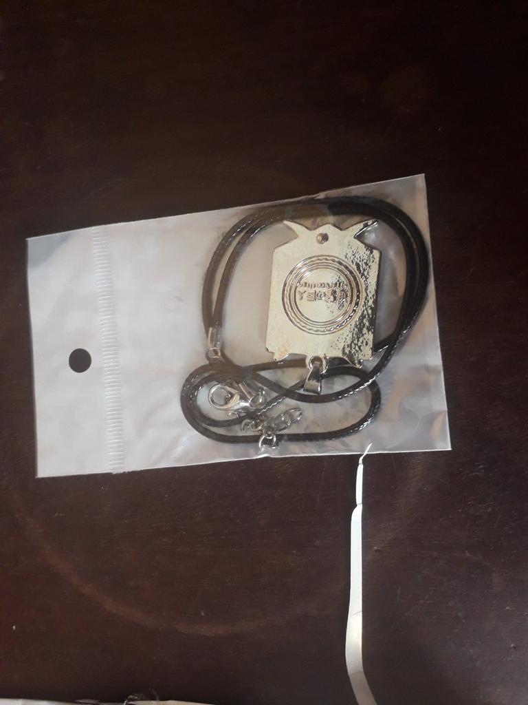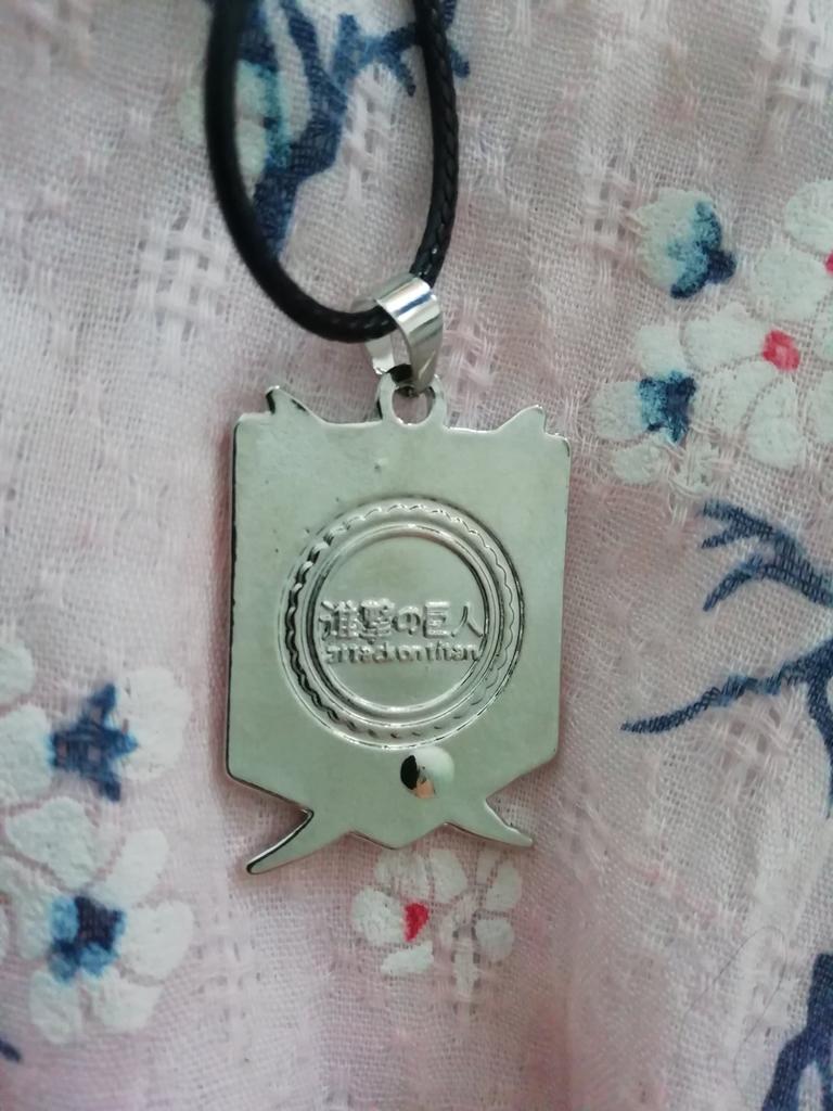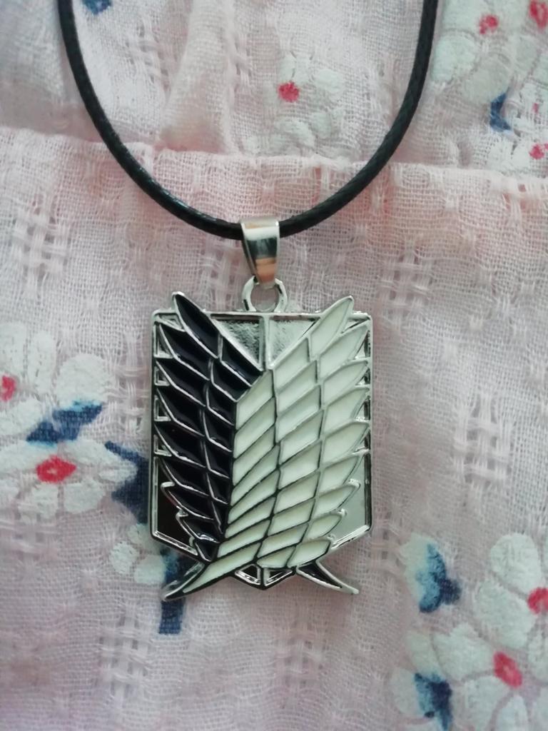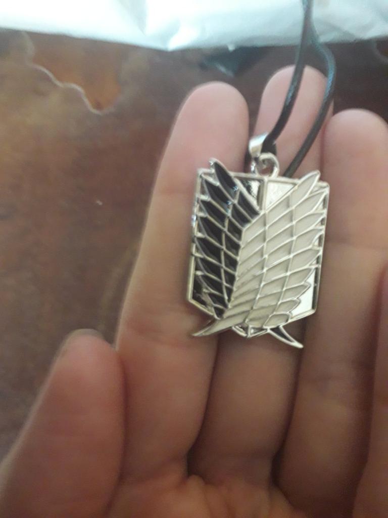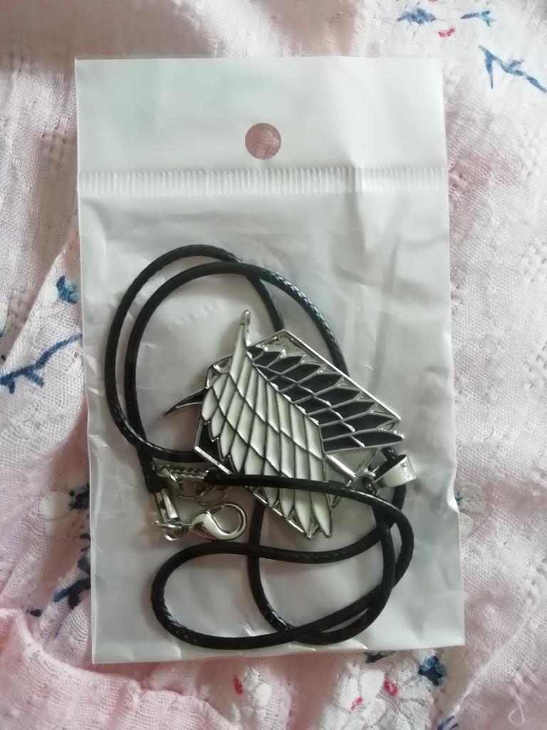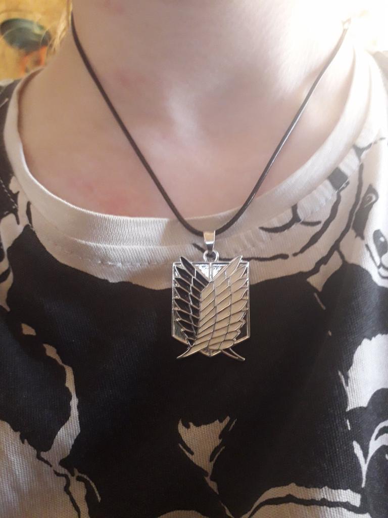 Заказывал в начале мая, пришло к концу июня(примерно полтора месяца шло). Отлично смотрится, очень красивый. Сзади написано "Атака титанов" на английском и японском как я понял. Сами крылья белого и тёмно-синего цвета. Если не всматриваться, то может казаться что там не синий, а черный. Верёвочка на которой держится отличная и хорошо гнётся. Так же, кулон сам по себе увесистый, не прямо тяжёлый, но вес имеет.