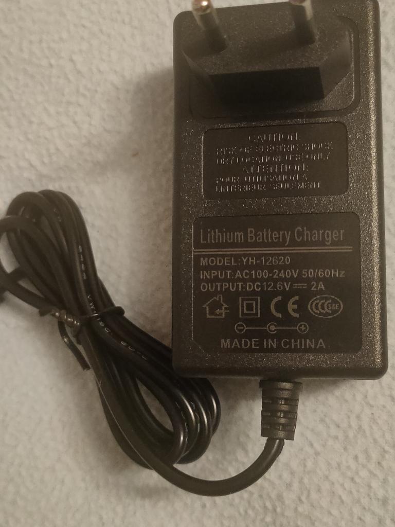 Зерядный блок 12.6 v 2A, индикатор светит''красным'' во время зарядки, ''зелёным'' по окончании. На вес лёгкий.