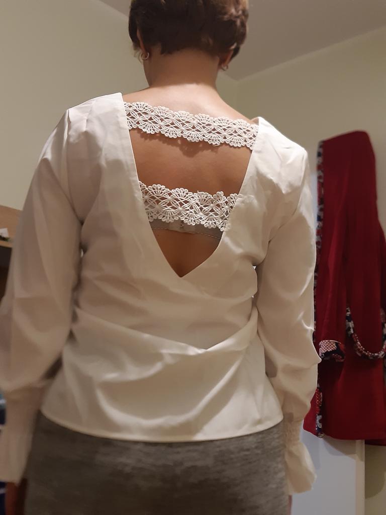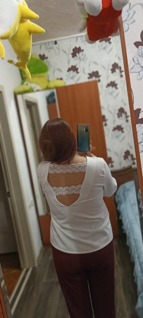 Качественная блузочка, швы ровные, нитки не торчат. Спинка смотрится оригинально, но не продуманы поперечные лямочки, нужно было делать нижнюю полоску на уровне бюстгальтера, чтобы прикрывала. Носить эту блузку лучше без бюстгальтера или в бюстгальтере с прозрачной спинкой. А так, к покупке рекомендую!