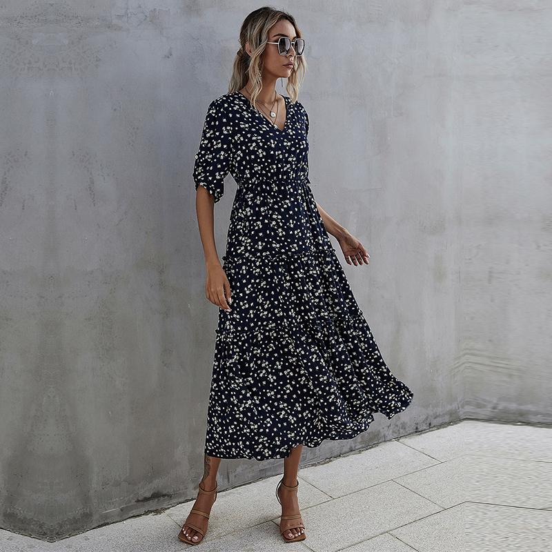 Летнее платье макси с принтом, длинное, тонкое, с V-образным вырезом, высокой талией, половиной рукава, темно-синее, SML XL — купить товар онлайн с бесплатной доставкой по всему миру!
