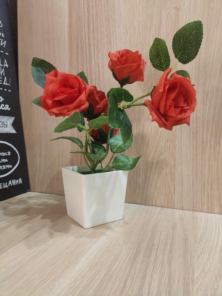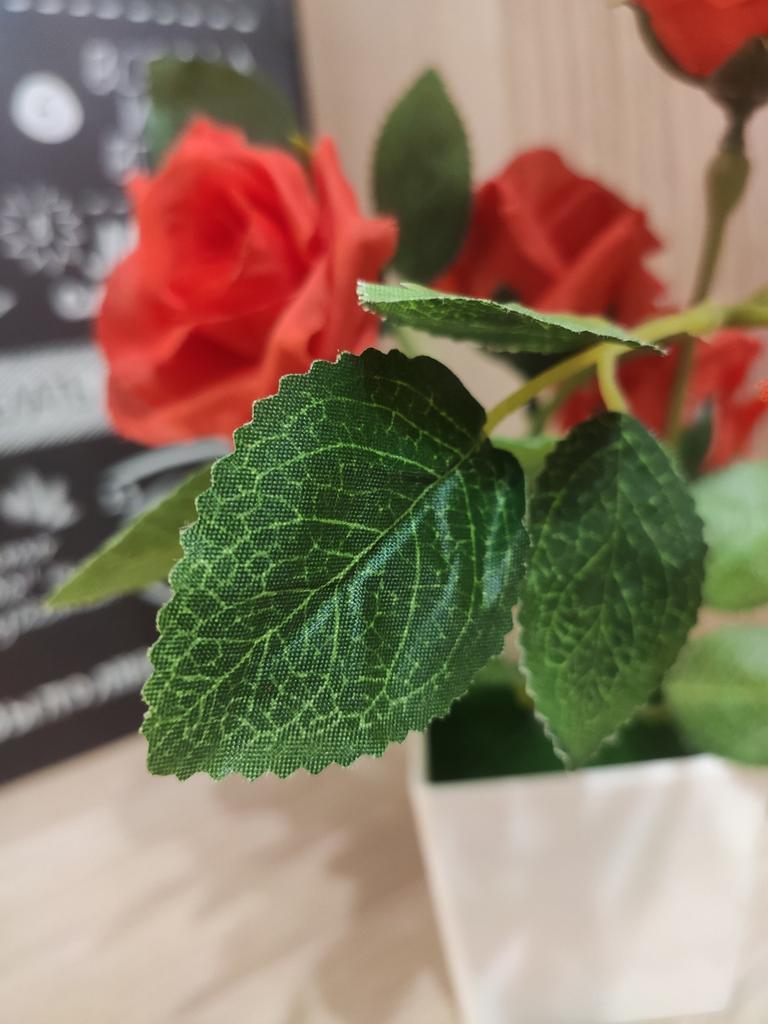 Искусственные розы в горшке очень красивые.🌹 Правда, складывается ощущение, что не хватает листьев.🍃 Один листочек приклеен криво (видно на последней фотографии) и на горшке нет надписей таких, как на фотографиях у продавца, но для меня так даже лучше. Искусственное растение имеет 5 бутонов.