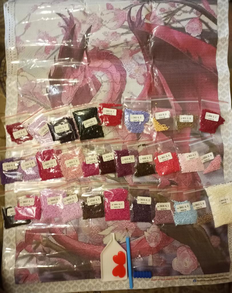 🐉 Дракон шикарный. Размер полотна 50*69.5,сама картина выкладки 45*64. Продавцу было бы ПОЛЕЗНО такие большие полотна на валик наматывать,помята до неприличия,заломы долго выпрямляются,утюгом не советую потому что с другой стороны липкий слой и не понятно как он себя поведет или приклеиться намертво или наоборот отклеиться нафиг. Стразы пронумерованы,все совпало.