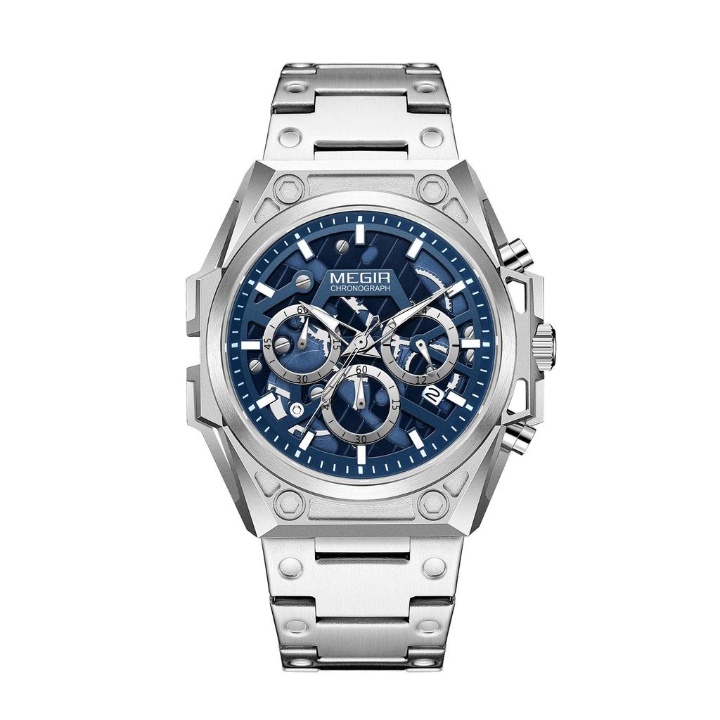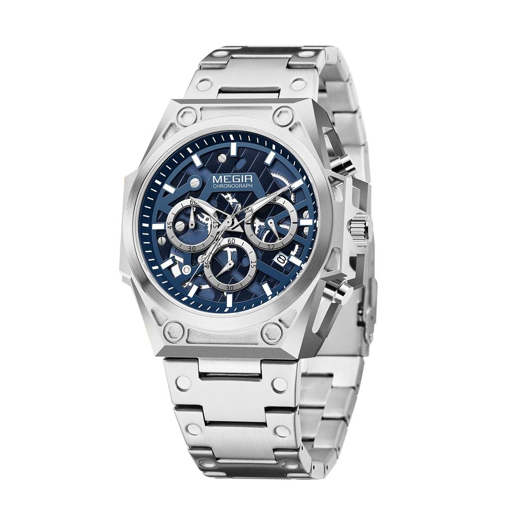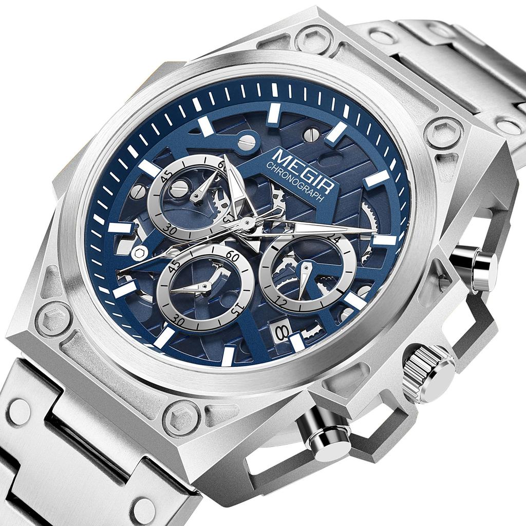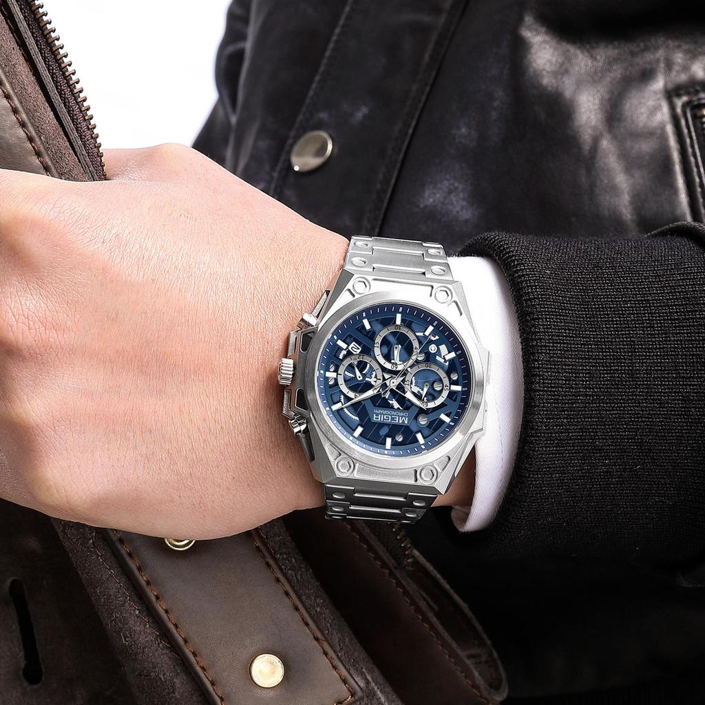 Megir Мужские кварцевые наручные часы креативного дизайна синего цвета из нержавеющей стали