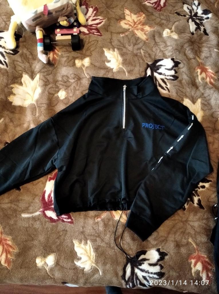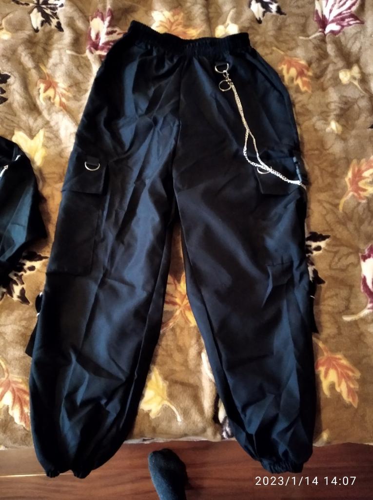 Брюки нормальные. Верх качество не очень... материал синтекика, не приятна к телу. Горловина очень свободная, надо переделывать. На самой кофте нашивка синяя не в тему... s размер на рост 152 длина штанов.