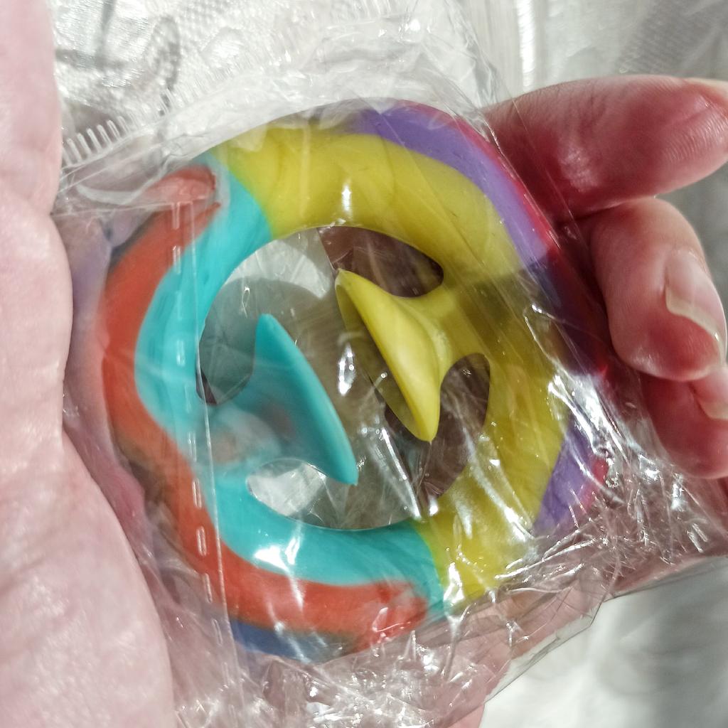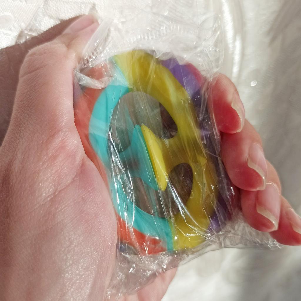 Яркая, радужная, но ребёнку 6 лет тяжело, точнее невозможно сдавить, чтоб присосалась между собой эта игрушка. Даже взрослому не на долго, рука устаёт. По мне, если она расчитана на детей, то больно жёсковата.