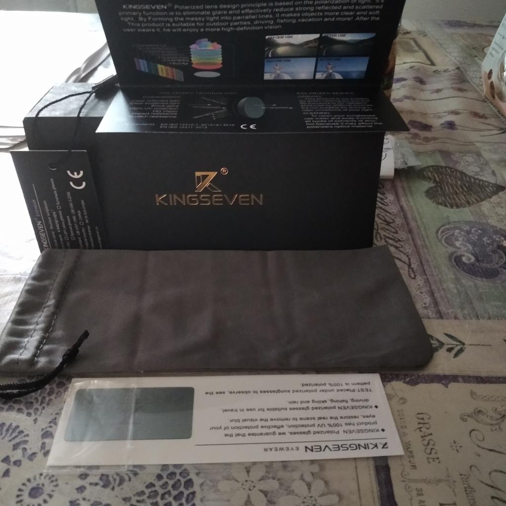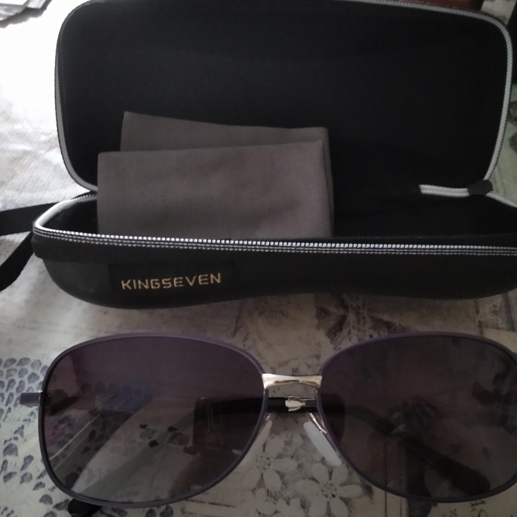 Заказ получен через месяц. Посылка из твердого крепкого картона. Ничего не повредилось в пути. В комплекте картонная упаковочная коробочка, полужесткий очечник (громоздкий для дамской сумочки), тонкий трикотажный очечник, салфетка для очков, буклет, тест на поляризацию - все с логотипом kingseven. Однако на самих очках почему-то логотипа нет. Скорее всего это добротная подделка. В целом очки удобные, тонкая металлическая оправа (лицевая часть окрашена в черный цвет).Легкие. Носоупоры мягкие силиконовые. Поляризация присутствует. Глаза не устают. За такие деньги вполне достойные очки. Рекомендую.На сайте производителя со скидкой цена 62$.