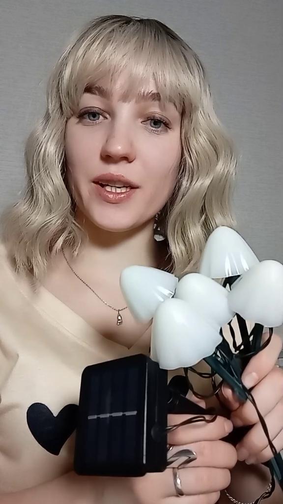 Светящиеся грибочки Упаковка была отличная, продавец позаботился о том чтобы товар дошёл в целости и сохранности. За это ему большое спасибо Ну и как уже выше сказано, всё целое и работает отлично Шляпки грибочков пришли как гирлянда, надеты на провод. Батарея была не заряжена , поставили на солнце и зарядили У гирляндочки есть два режима, моргающий и постоянно светящийся. Мне конечно же больше понравился просто свет. В темноте светят ярко, в сумрак тоже светят. Но как только на батарею падает яркий свет она сама перестаёт светить. Её не нужно постоянно включать и выключать. Она сама видит когда наступает утро. Я думаю, что при пасмурной погоде тоже будет светиться. Брала сестре на дачу, как только доберусь до сестры добавлю фото. Очень довольна покупкой.