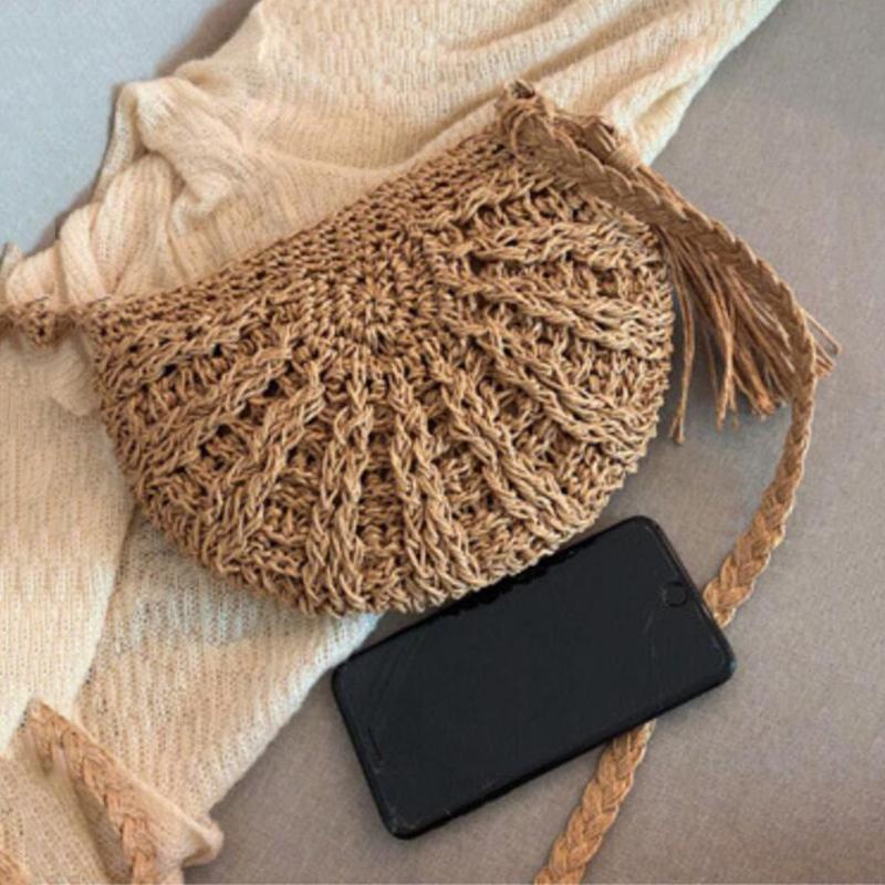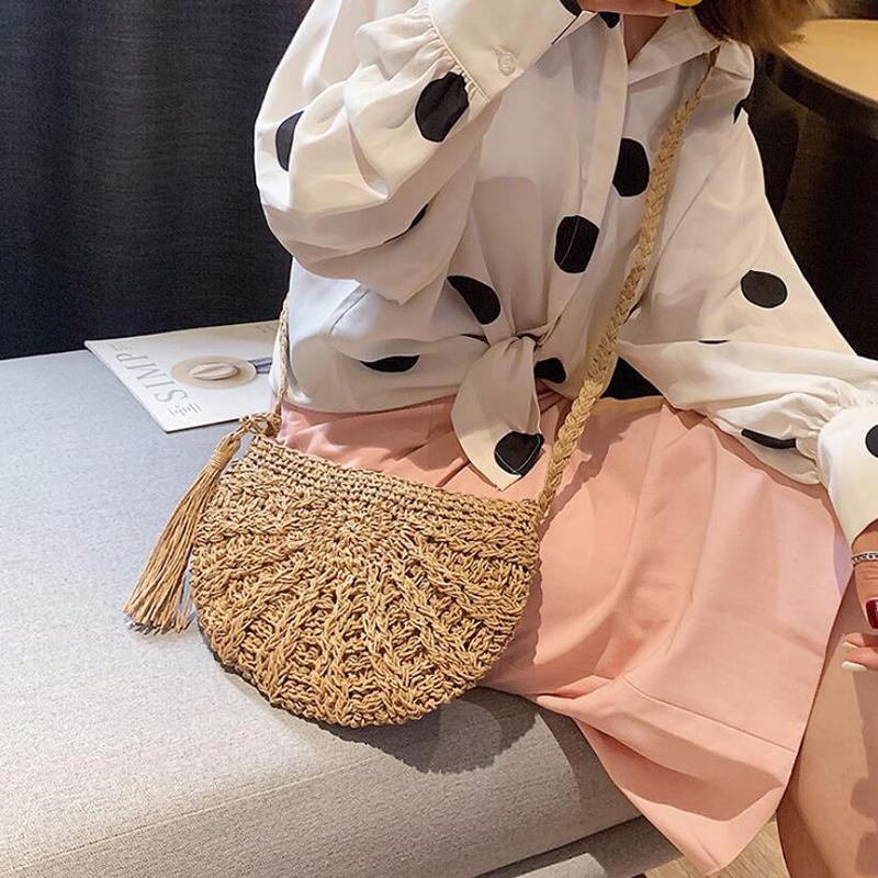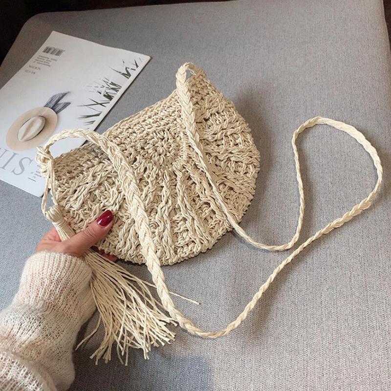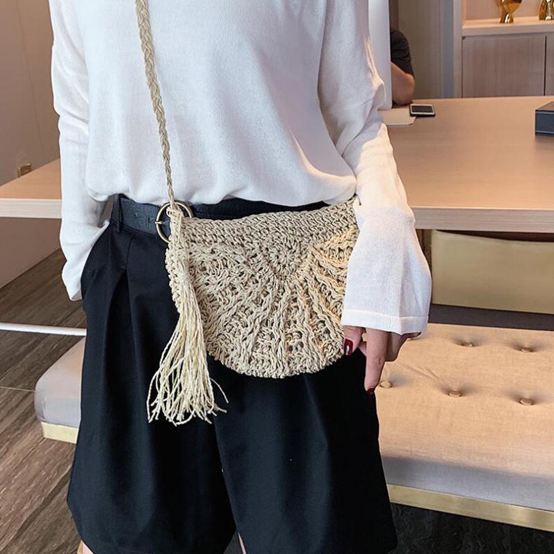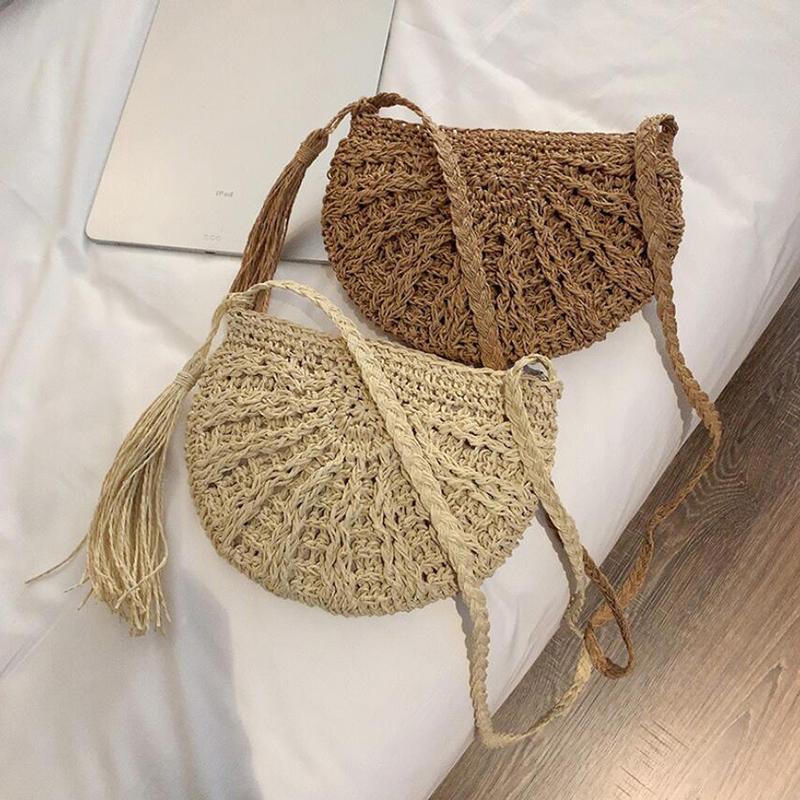 Женская полукруглая сумка с кисточками, соломенная сумка через плечо с луной, летние дорожные вязаные сумки из ротанга