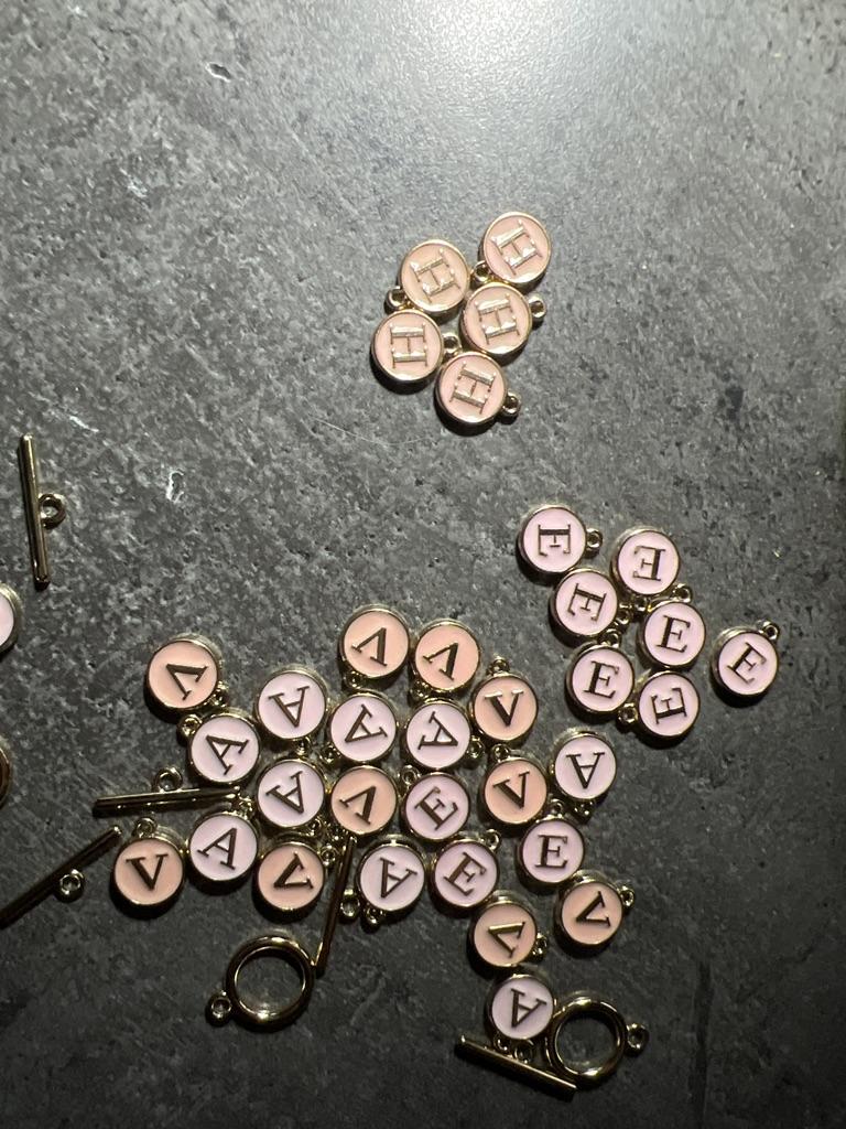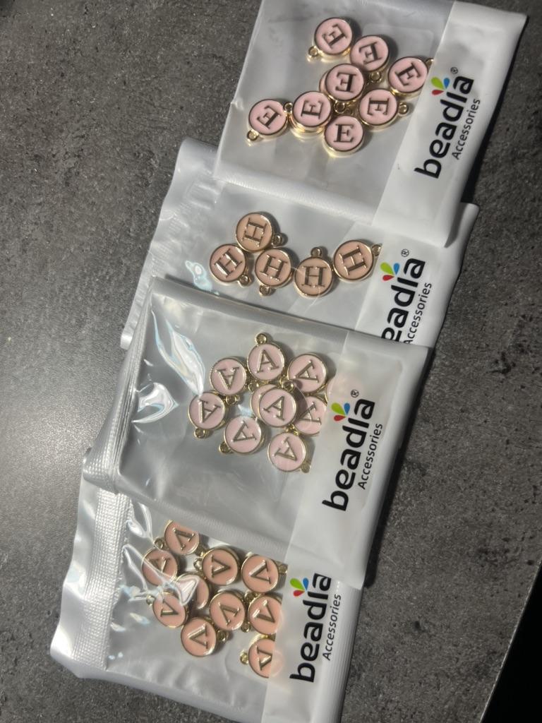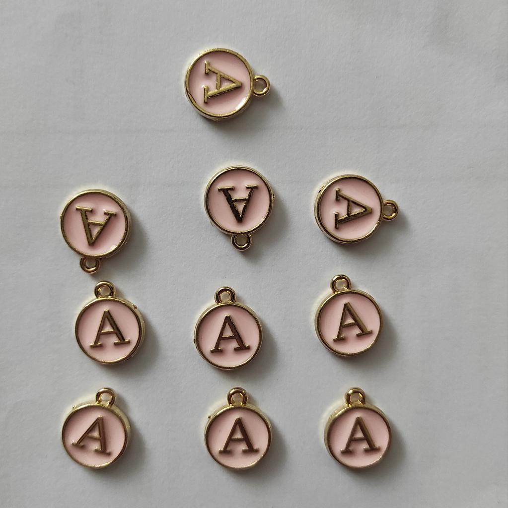 Подвеска Буква А В пакетике 10 шт. Цвет - розовый, как на фото. Буквы золотистые. Диаметр 1см. Все целые. Цвет ровный. Продавца рекомендую. Доставка до Молдовы долгая, из-за проблем на Украине