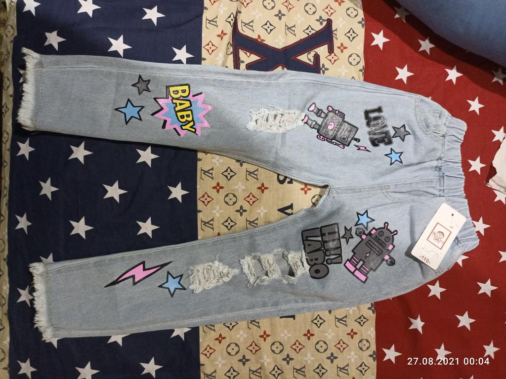 Джинсы очень классные,наклейки яркие.Брала по размерной сетке,ещё не меряли.Продавцу спасибо.