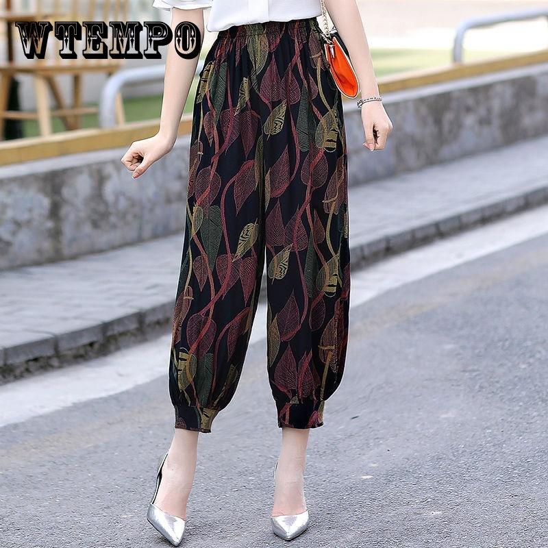 WTEMPO Укороченные брюки. Летние повседневные широкие брюки из хлопка и шелка с эластичной талией. Брюки-фонарики. — купить товар онлайн с бесплатной доставкой до всему миру!