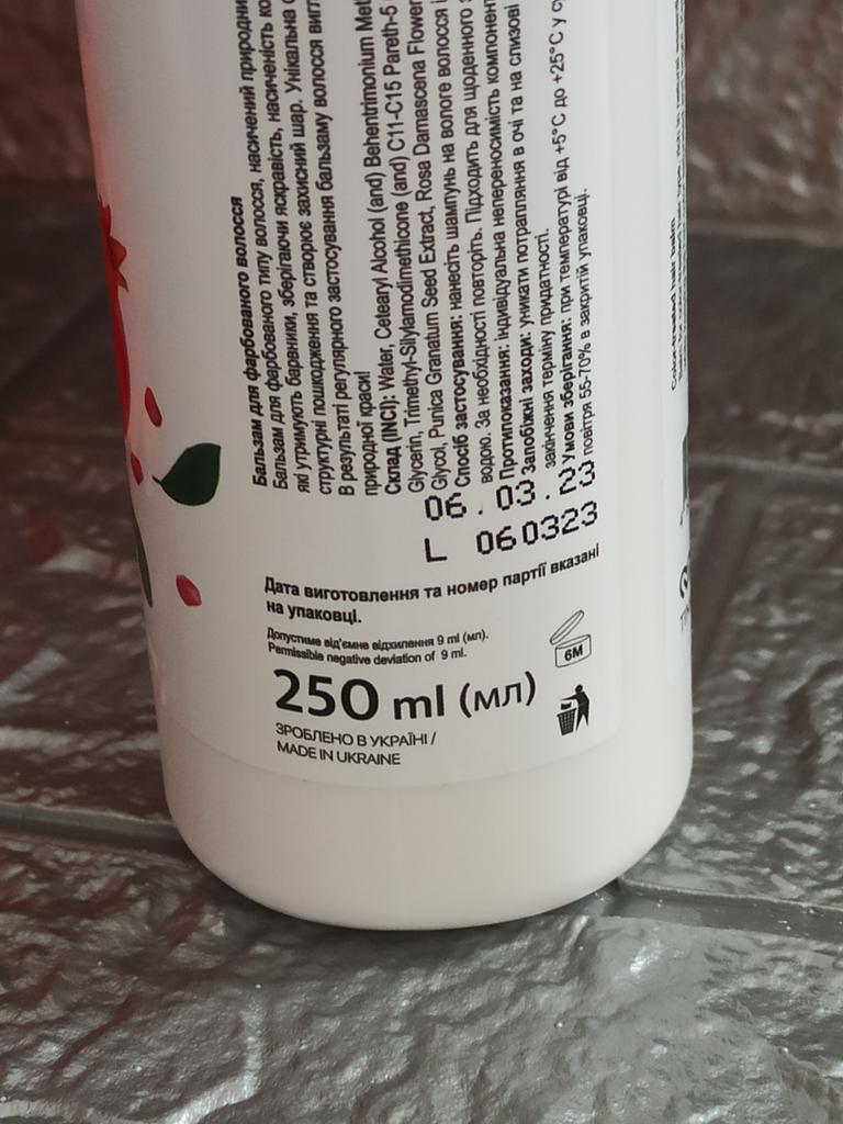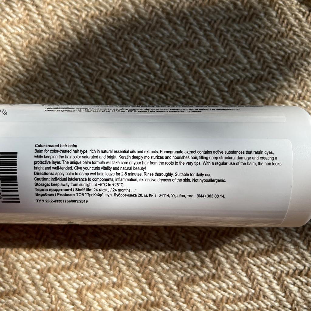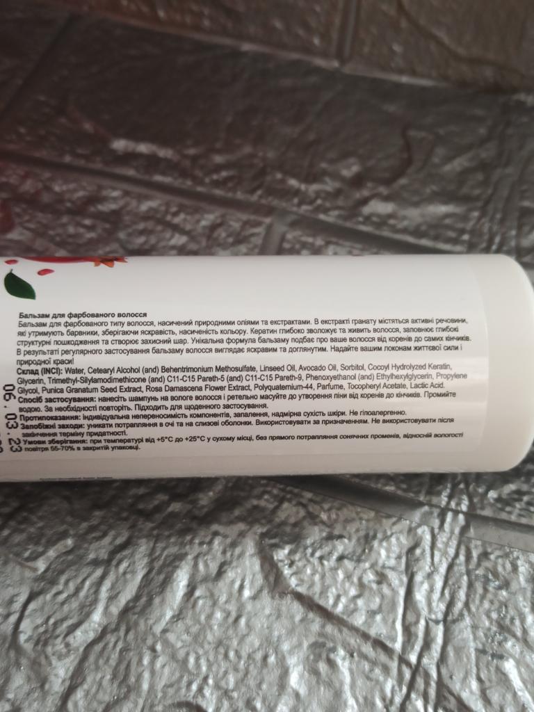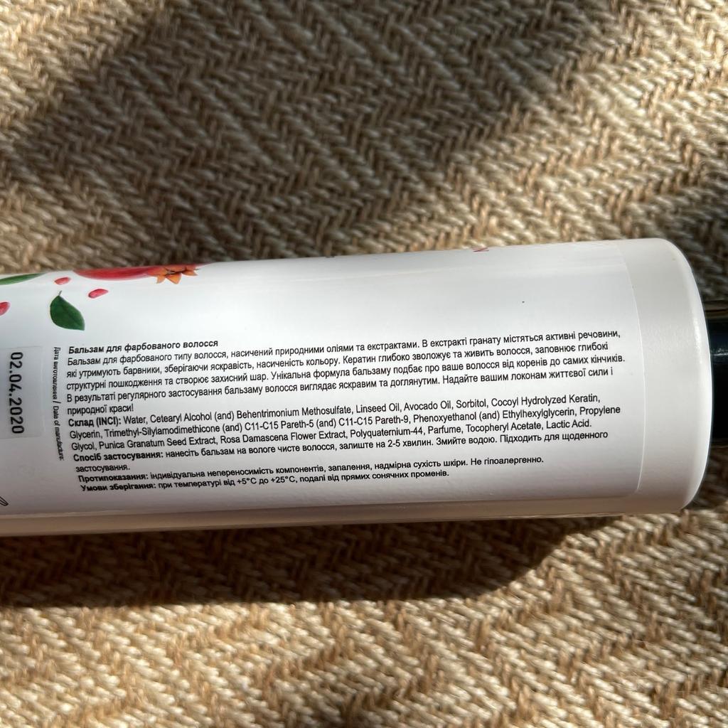 Бальзам для окрашенных волос. Так как я часто крашу волосы,и они со временем приобретают тусклый вид, то я решила заказать такой бальзам. Состав бальзама: экстракт граната, кератин, льняное масло, масло авокадо, экстракт цветков розы, глицерин. Бальзам заполняет и укрепляет структуру волос, не утяжеляя их. Состав бальзама обогащен натуральными экстрактами и растительными маслами. Экстракт граната содержит активные вещества, которые предотвращают вымывание красящих пигментов, сохраняя яркость и насыщенность цвета. Кератин обеспечивает волосам глубокое питание и увлажнение, заполняет поврежденные участки и образует защитный слой. С помощью бальзама мы ухаживаем за волосами от корней до кончиков, возвращая им жизненную силу и природную красоту. Способ применения: на чистые вымытые волосы нанести бальзам, выдержать 2-5 мин. и смыть теплой водой. После применения бальзама волосы становятся шелковистыми, мягкими приобретают естественный блеск.. Объем бальзама 250 гр. Нежный фруктовый запах. Бальзам понравился, рекомендую.