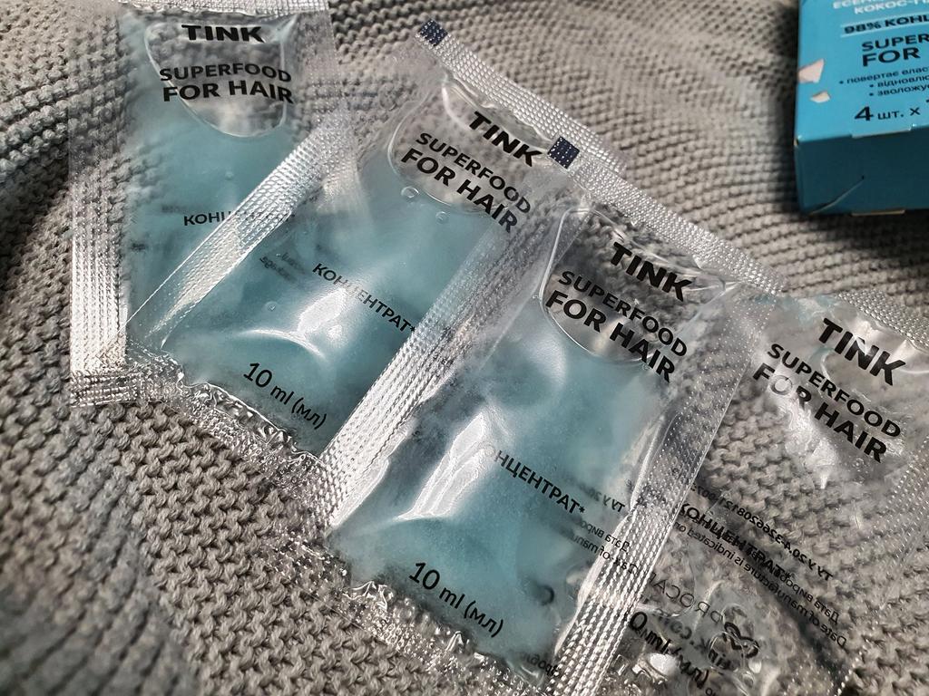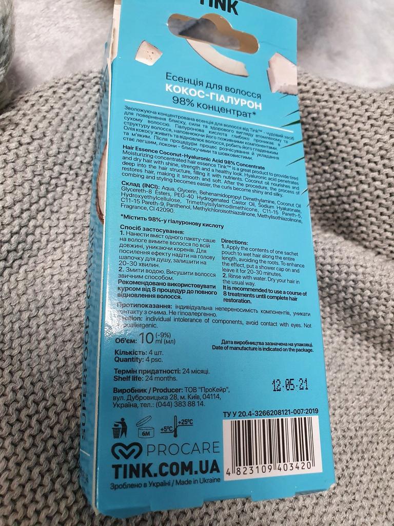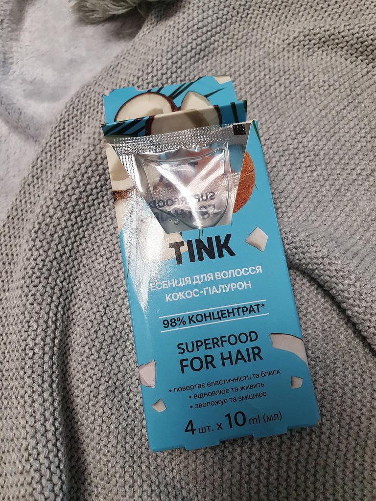 Достоинства: Концентрат для волос TINK Украина В упаковке 4 штуки жидкости по 10 мл. Приятный аромат кокоса 95% концентрат Возвращает эластичность и блеск, восстанавливает волос, увлажняет и укрепляет Я очень довольна 😌 эффектом спасибо большое продавцу. Способ применения Нанести содержимое одного пакета-саше на влажные вымытые волосы по всей длине, избегая корней. Для усиления эффекта надеть на голову шапочку для душа, оставить на 20-30 минут. 2. Смыть водой. Высушить волосы привычным способом. Рекомендовано использовать курсом от 8 процедур до полного восстановления волос. Средство дарит блеск и красоту обессиленному, тусклом волосам. Доставка по Украине 4 дня