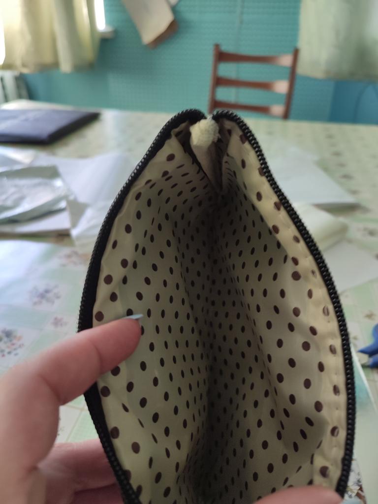 Косметичка очень хорошая, вместительная. Без запаха, нитки не торчат, молния работает хорошо.