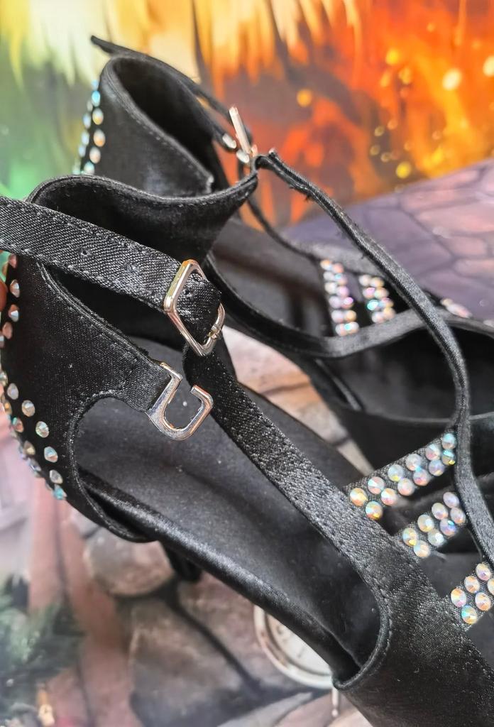 Шикарные туфли для бальных и латиноамериканских танцев. Доставка заняла чуть больше месяца до отделения Укрпочты, соборная посылка Joom. Упакованы туфли надёжно, в почтовую коробку. В комплект продавец положил вкладыши для пяток и ароматические пакетики. В магазине широкий размерный ряд 35-42. Я заказала размер 42 на мою стопу 26 см. Туфли сели впритык, но для танцев так и должно быть. На ноге туфли сидят максимально плотно, при этом вполне комфортно. Высота каблука 8,5-9 см, достаточно устойчивый каблук. Модель украшена двумя пряжками и стразами, за счет которых можно регулировать полноту. На подъёме ремешок соединён, что позволяет хорошо зафиксировать ногу. Ремешок застегивается на пряжку. Мягкая влагопоглащающая стелька придает комфорт обуви. Материал подкладки хорошо поглощает влагу, поэтому стопа в данной обуви не скользит. Подошва из замши не скользит на паркете. Эта ообувь является достаточно гибкой и позволяет больше работать стопой. Туфли невероятно красивые, смотрятся на ноге шикарно, при этом достаточно удобные и созданы специально для танцев на паркете, я приобретением полностью довольна и к покупке однозначно рекомендую!