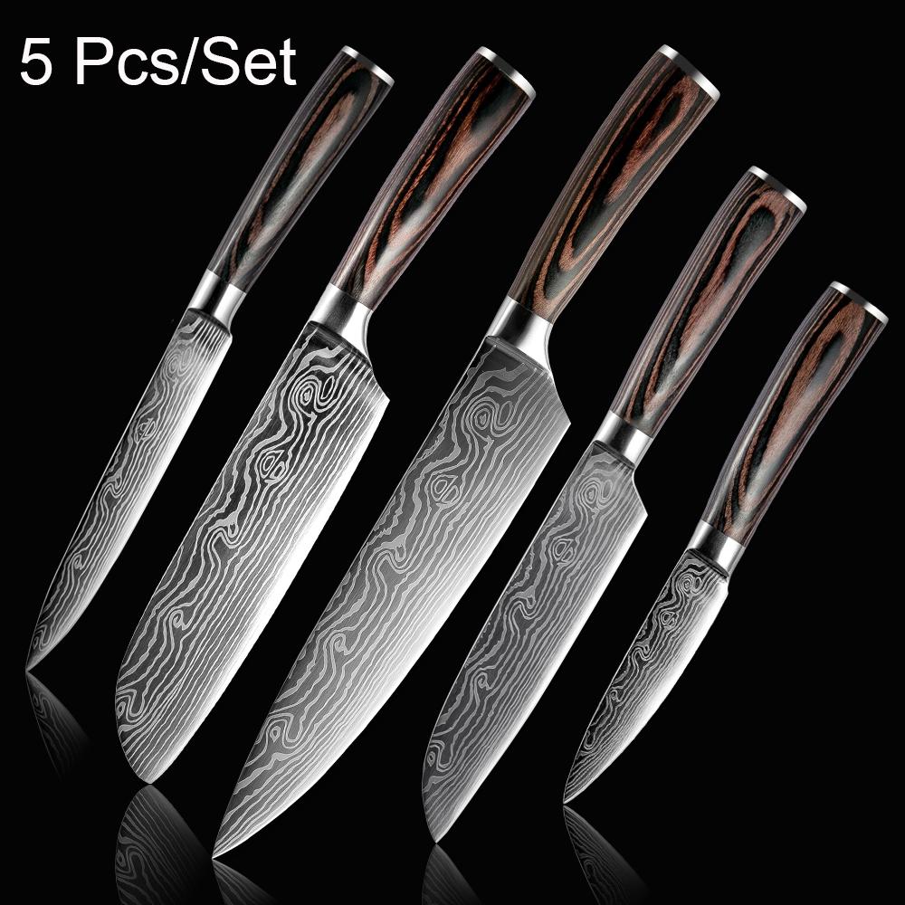 5 шт. кухонный нож из нержавеющей стали с лезвием дамасского лазера набор ножей шеф-повара