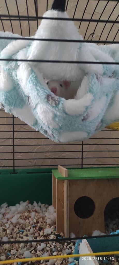 Большой и мягкий. Редко туда залазит но всё таки пользуется. На удивление не сгрызла. Лучше брать для большой клетки. Занимает не мало места