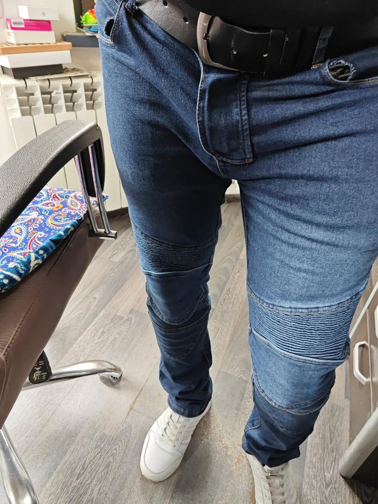 Мото джинсы отличные за свои деньги. До этого брал размер XL для меня были великоваты. Мой рост 178, вес 95 бедра 110 талия 100 - размер L прям идеально в обтяжку и защита колен находится именно на уровне коленной чашки. Джинсы в меру тянутся.