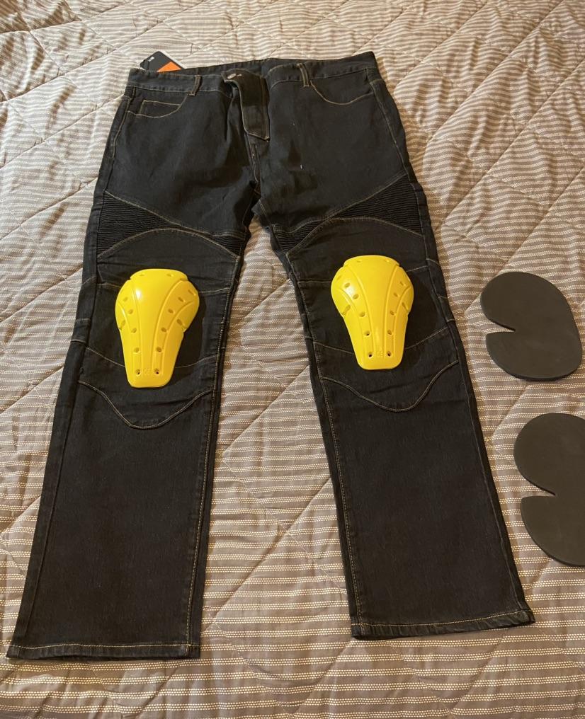 Джинсы отличные. Размер L идеально подошёл на мои параметры (ношу джинсы 36 размера) примерно бедра 110 талия 100, рост 178. Хорошо тянутся. Коленные защиты виниловые или резиновые, а боковые из пористого 5 мм материала( но при желании можно другие вставить) В общем рекомендую. Цена-качество соответствует
