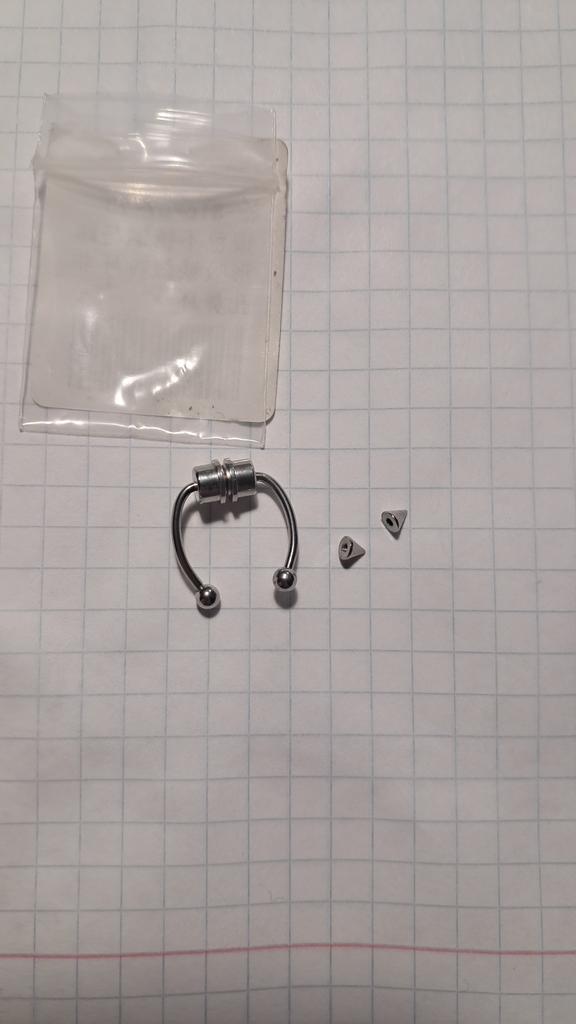 пришел быстро,но минусы есть:широкий(приходится настраивать),не прочный,одела 1 раз и он поломался,пришлось садить на супер клей из плюсов:если настроить(что очень сложно) смотрится как настоящий пирсинг,так же хорошие магниты но на хрящ не надеваются товаром довольна но минусов больше чем плюсов PS: выбирайте маленький размер
