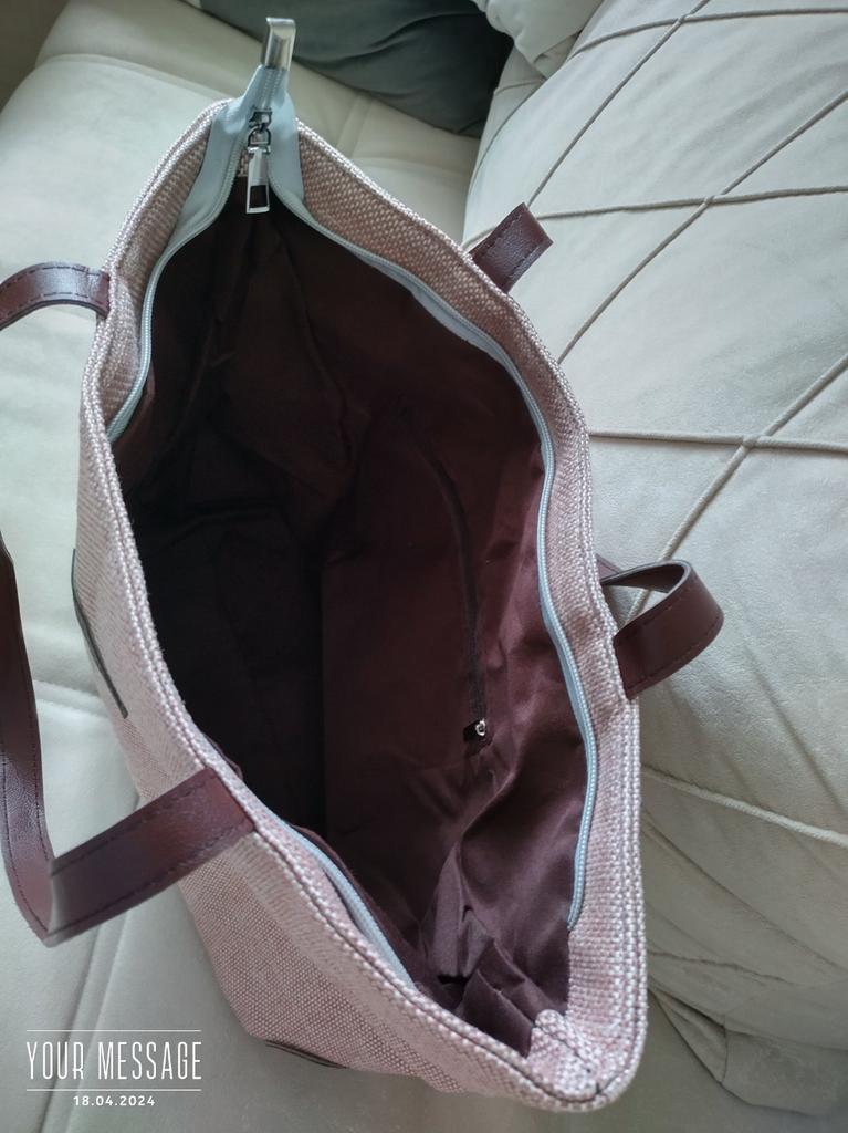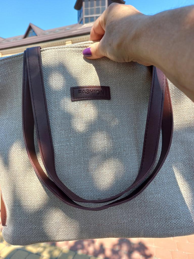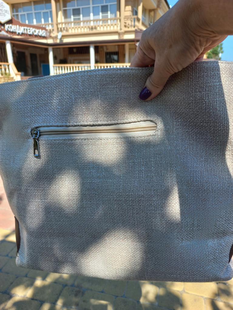 Пришла в сборной посылке очень помята. Материал - обычная серая мешковина, смотрится дёшево. Ручки - вообще, дешманский дермантин, плюс с отвратительным запахом. Теперь вот думаю, как выпрямить её, наверное, буду отпаривать. На работу ходить пойдёт, работаю на предприятии, в раздевалке прячем личные вещи в шкафы, никто не увидит)). Единственный плюс для меня - вместительная, уместится обед в неё)). Добавляю отзыв. Один раз прошлась с этой сумкой, и... от трения с одеждой появились катышки. Одним словом - дешёвая некачественная вещь. Внутри карман на молнии, но маленький, даже паспорт не поместился.