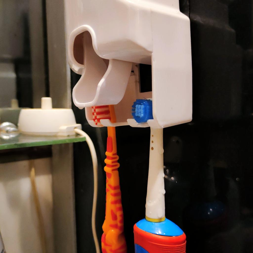 Дозатор для зубной пасты и держатель для двух щеток. Прекрасная компания для благоустройства ванной комнаты ✌️😁 Чистить зубы - задача муторная. Ежедневная Почему бы не облегчить себе труд? Чтобы хотя бы пасту на щётку выдавливала машина? 😜 🔸Да, это вещь стоящая! Особенно если у тебя малыш. 🔸Кроме того, в дозатора есть два держателя для зубных щеток. 🔸Можно повесить как простые, так и насадки для орал-би. Крепится аппарат на крепеж,,который в свою очередь клеится на ровную поверхность при помощи скотча. Держится отлично 👍 Функционал то что надо 😌