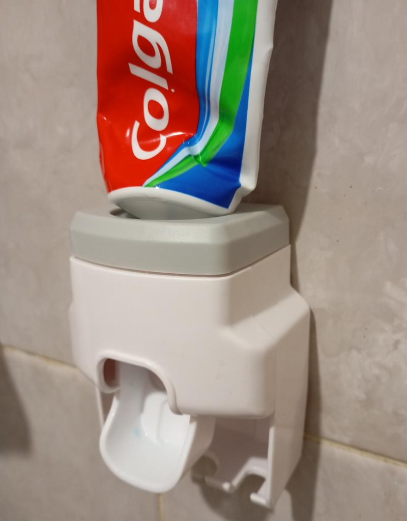 Настенный дозатор зубной пасты🪥 Купила по акции "Товар дня", то есть почти даром - это радует☺️ ✨ Дозатор белого цвета, упакован в коробку, инструкции нет, но механизм несложный, разобраться можно и без описания ✨К стене крепится с помощью липкого квадратика ✨Внизу есть прорези, куда можно вешать зубные щётки. Но не все влезают, моя с длинной полоской щетины не влезла, как и новая тройная ❗❗❗Подходит не для всех тюбиков. Мой Elmex не пристроить, у него практически нет "горлышка" с резьбой. Этот большой Колгейт тоже пришлось силой закручивать, а вот такой же тюбик поменьше сел бы хорошо❗❗❗ Чтобы паста вылезла через отверстие, нужно с силой нажать на рычаг-качельку щеткой, выдавится нужная доза пасты. Прикольно! Удачных покупок💋