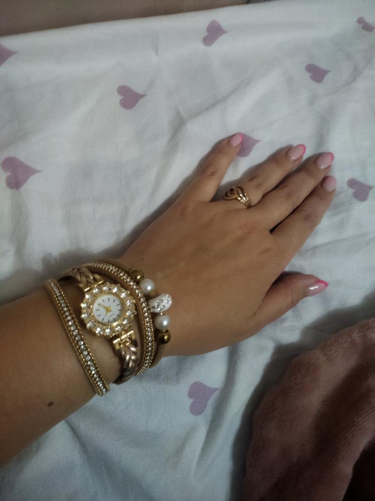 Мне очень нравится дизайн этих часиков. Ходят точно. Ремешок подошёл по объему руки, потому что имеет 2 кнопочки на разный размер. Я периодически любуюсь этой красотой. Не могу дождаться лета, чтобы носить часики каждый день.