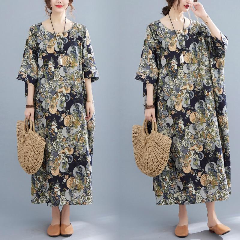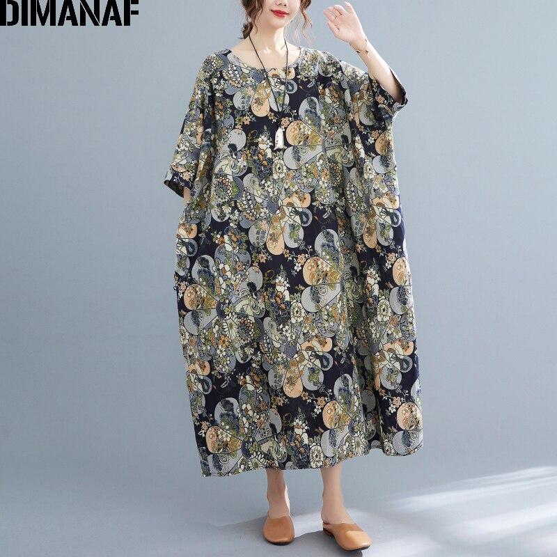DIMANAF 2021 Платье женское больших размеров Винтажный цветочный принт Пляжный отпуск Летний сарафан Платье Свободное Длинное платье Оверсайз 5XL 6XL