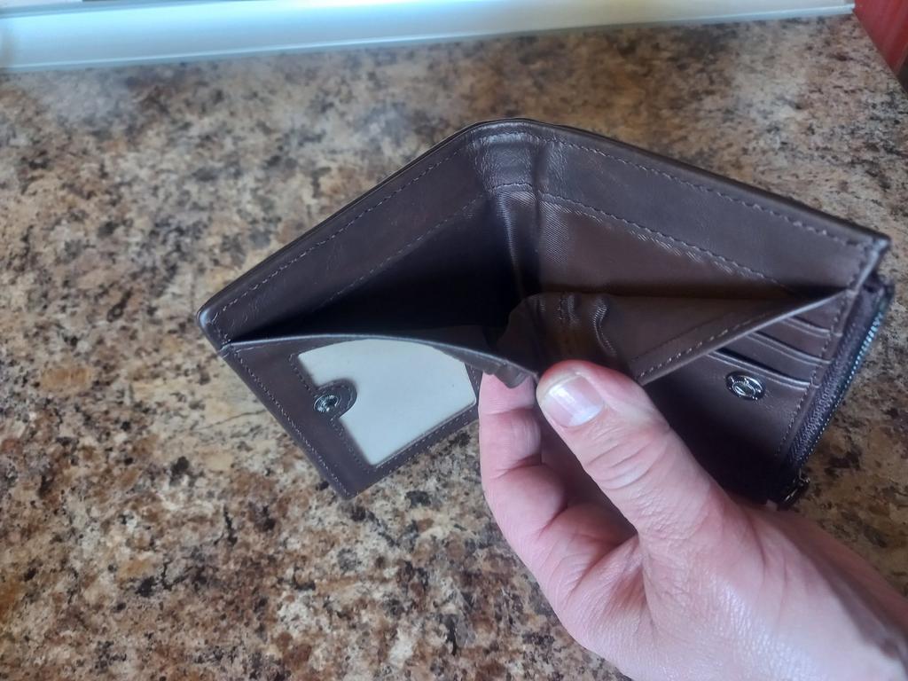 Для любителей маленьких кошельков то что нужно. На ощупь, визуально и по запаху, похоже на натуральную кожу, но 100 % не уверен. Для купюр только одно отделение, что для меня плохо. На лицевой стороне карманчик на молнии для мелочи и в торце ещё один тоже на молнии. Есть карманчики для банковской карты, визиток и т.п.