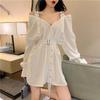 Черно-белое длинное платье-рубашка женское с длинным рукавом с v-образным вырезом и пуговицами, платья с открытыми плечами, сексуальные бандажные летние платья