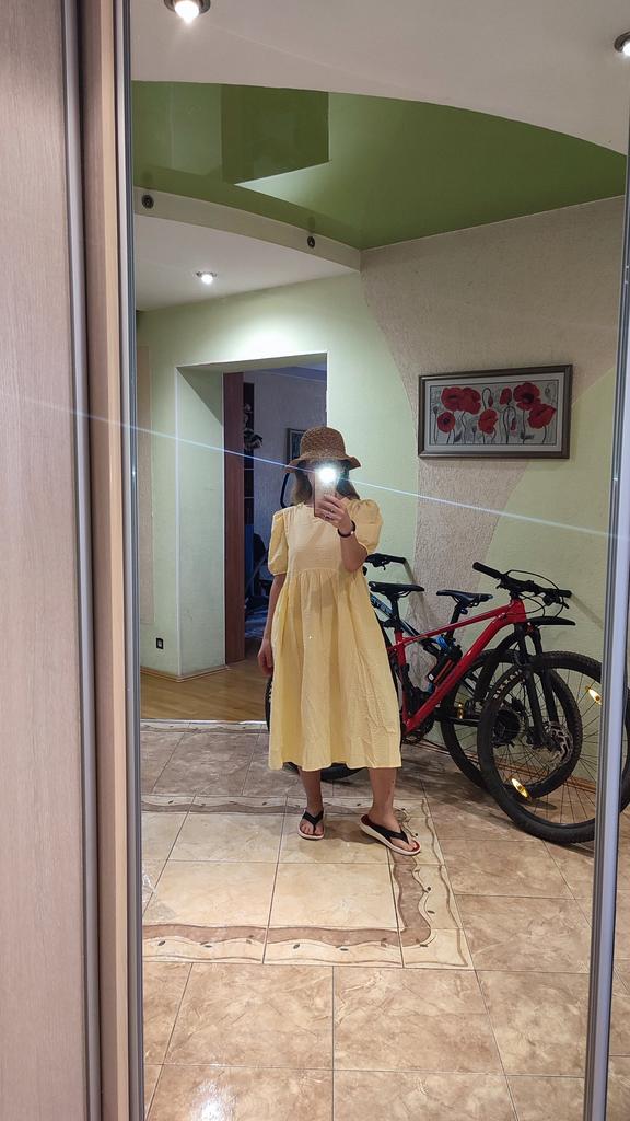 Платье понравилось, хоть и размер S оно большого покроя такая задумка, вверх на 42 р-р низ L, беременным смело можно заказывать 🤭, ОГ=48см х 2, длина 108см, имеются карманы, ткань х/б; из минусов мнётся и на рукаве резиночка на худенькую руку по объему 13см x2. 1374 ₽ Товар шёл до Екб 1 месяц