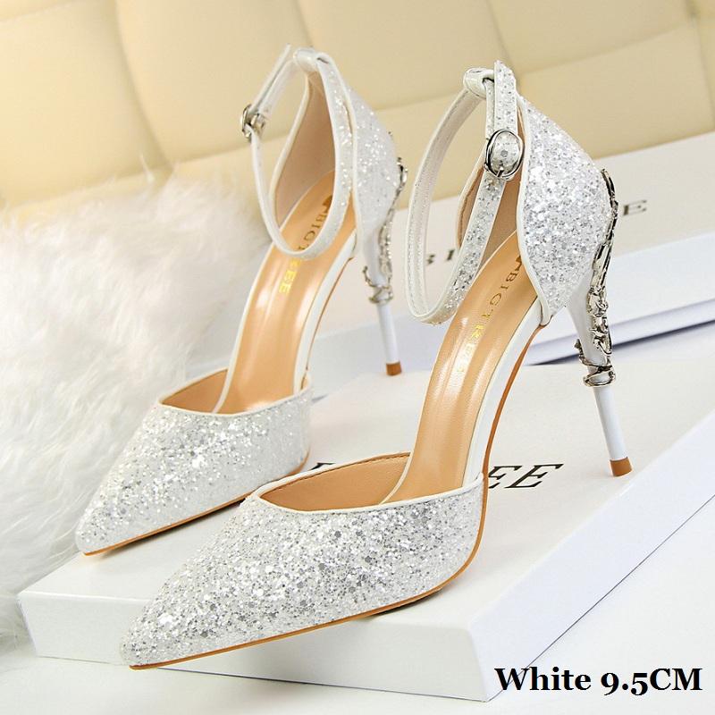 Bigtree Европейская и американская мода, сексуальный высокий каблук с блестками и блестками, высокий каблук 9,5 см, металлический каблук для показа в ночном клубе и сандалии