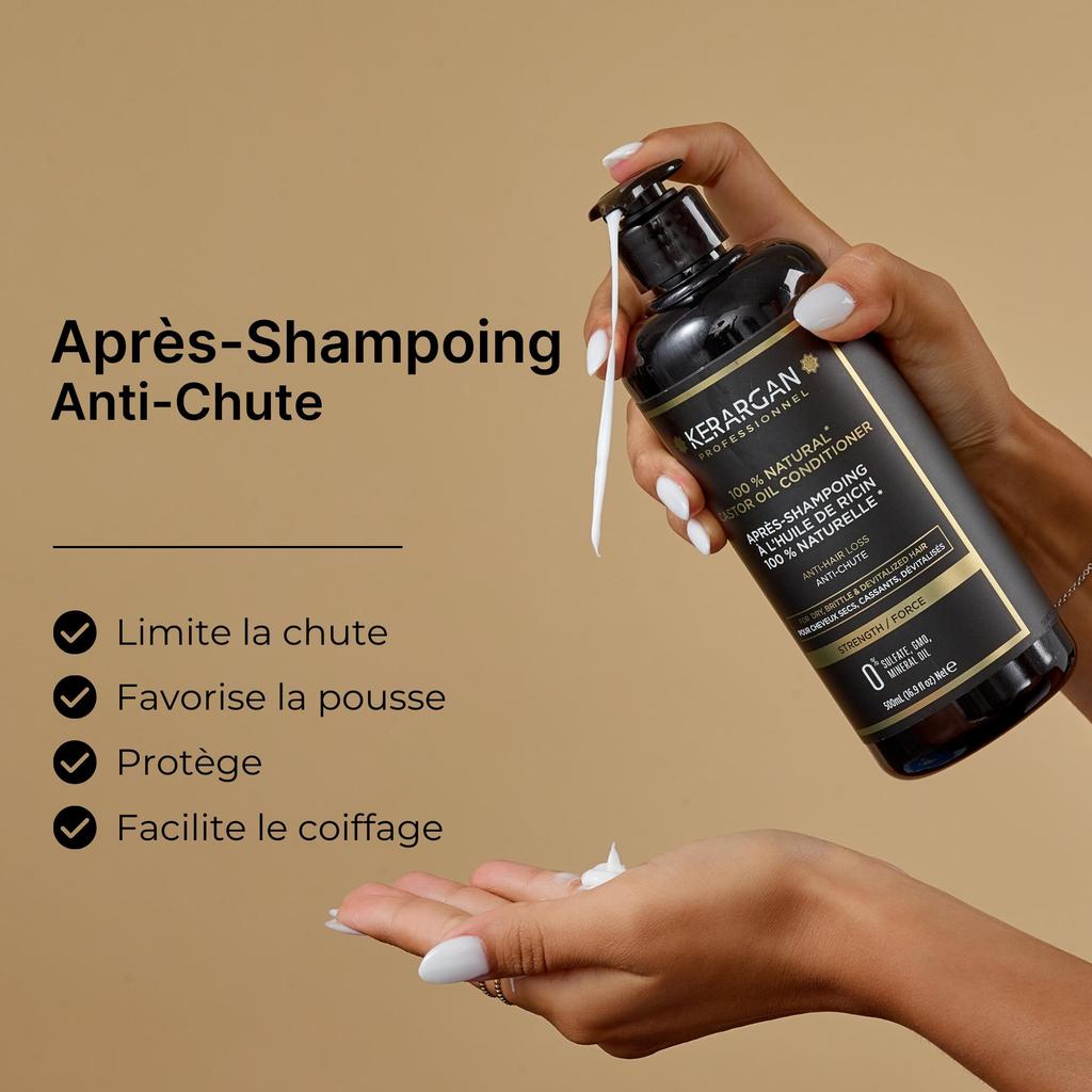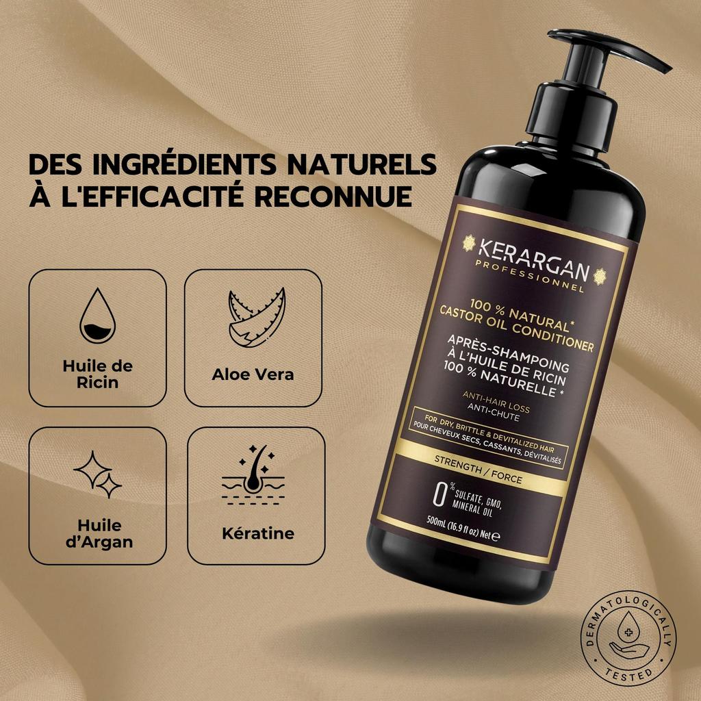 Наш кондиционер, обогащенный касторовым маслом, укрепляет и восстанавливает кожу головы. Это почти волшебное масло ускоряет рост волос, повышает их прочность и все это для вашего наибольшего счастья. Его формула, основанная на растительных, натуральных и органических маслах, маслах арганы и жожоба, глубоко увлажняет и восстанавливает волосы, а также усиливает действие жирных кислот, содержащихся в касторовом масле. Таким образом, ваши волосы восстанавливают объем, блеск и силу против ежедневных агрессий. Исключительные свойства касторового масла в сочетании с нашими ноу-хау и нашим опытом позволяют нам предлагать вам продукты, которые адаптируются к вашим потребностям, как мужчинам, так и женщинам, и для всех типов волос; длинные, короткие, тонкие, густые, курчавые, прямые, вьющиеся. Мы рекомендуем комбинировать использование нашего кондиционера; к нашему шампуню, обогащенному касторовым маслом, которое гарантирует длительную защиту ваших волос.