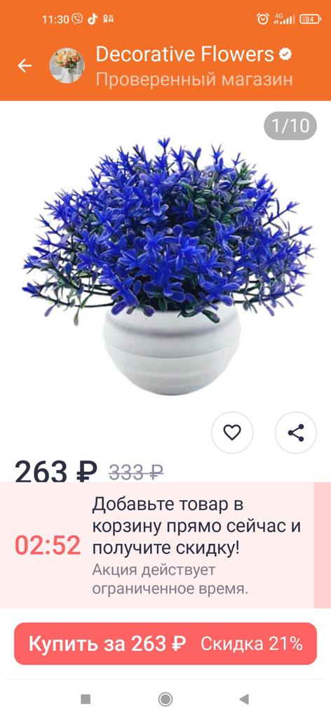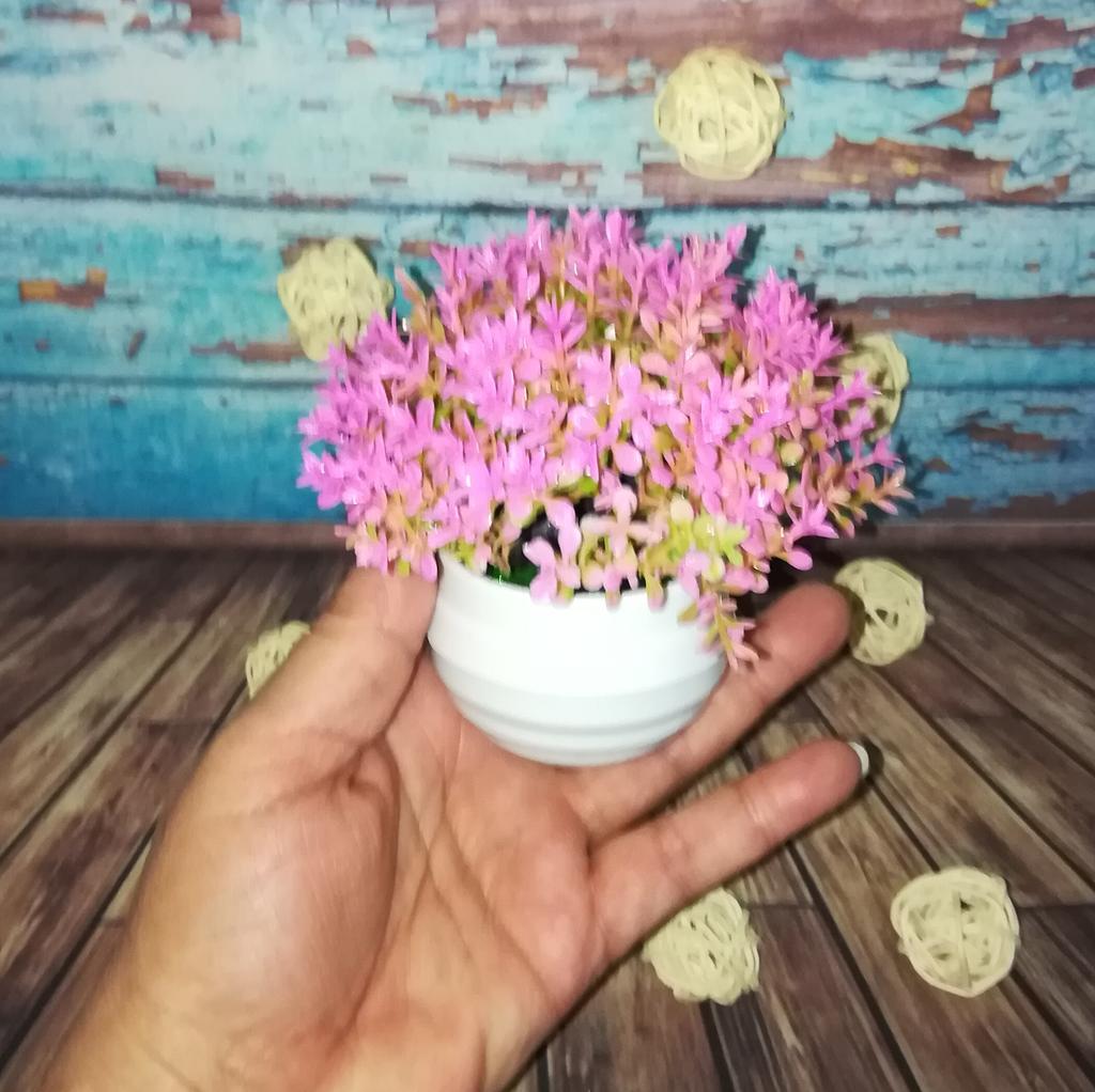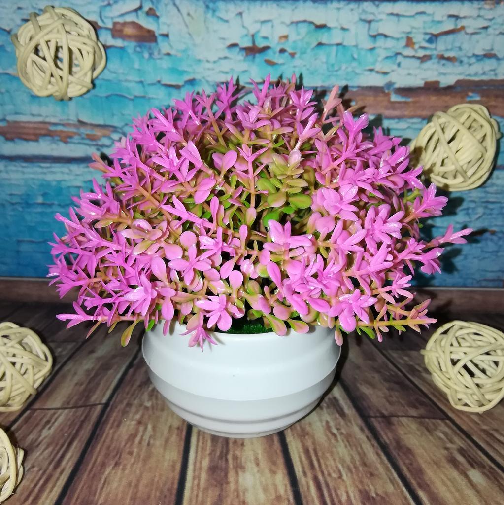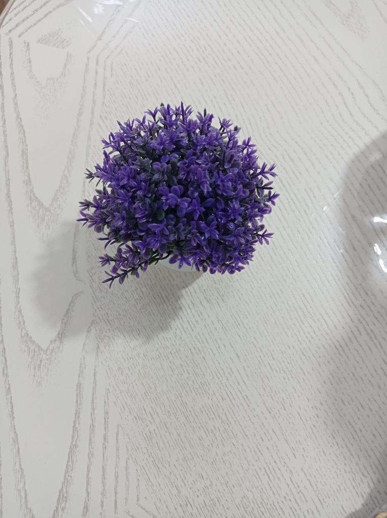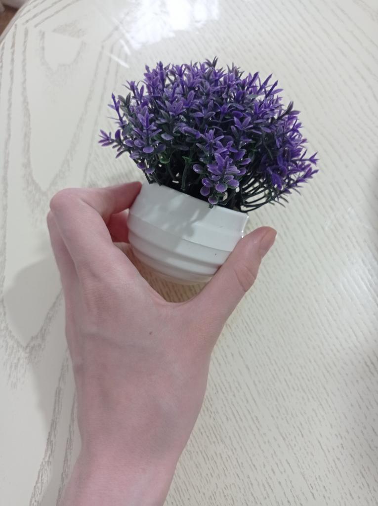 Мини- букетик! Мои ожидания были другими,конечно! Пластмассовый горшочек и мелкие фиолетовые цветочки.На картинке они смотрятся веселее, на самом деле цвет пожухлый.Если его использовать,то надо продумать откуда его будет видно,чтоб приносить радость! Цена маленькая, она оправдывает такие формы.Цвет на вашем фото и то,что мне пришло ооочень не совпадают.