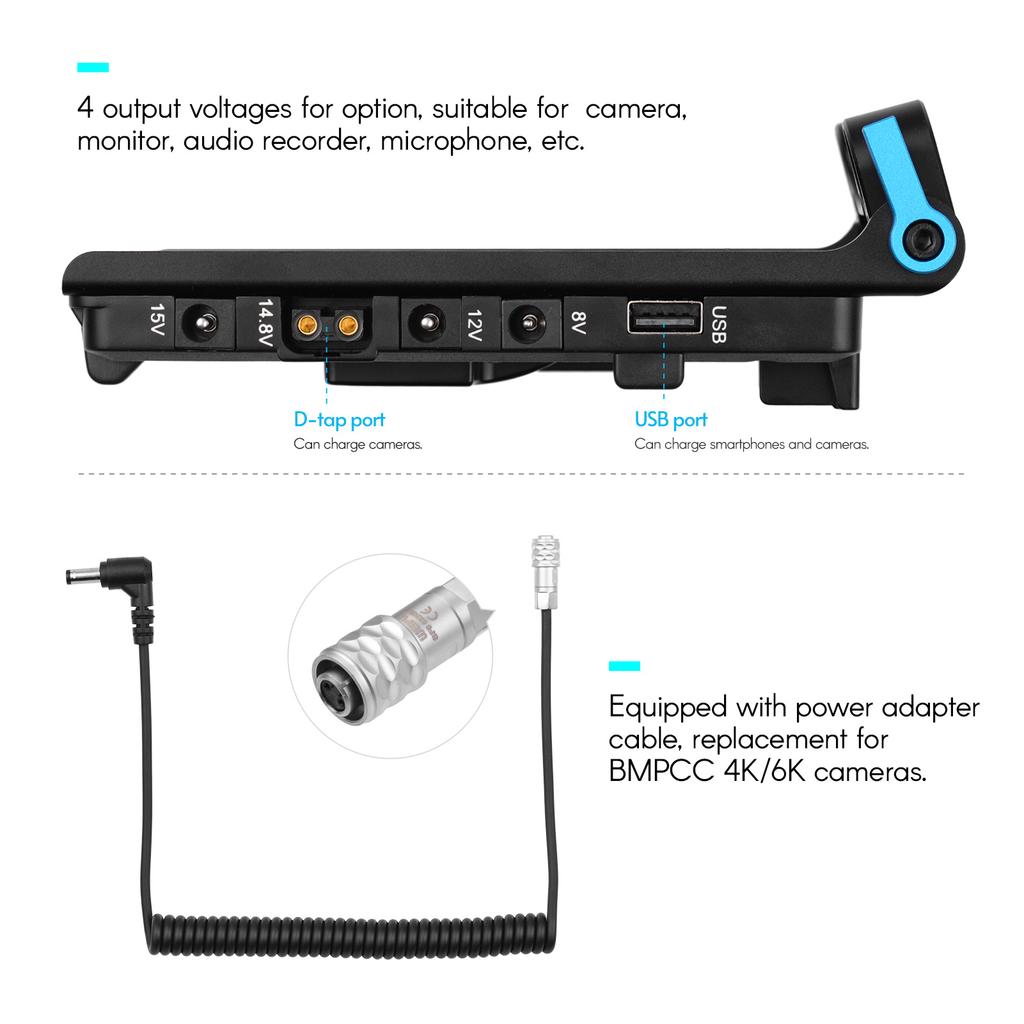 Стандартная V-mount аккумуляторная пластина для использования вместе с фиктивной батареей для замены традиционной батареи, может значительно продлить время съемки, больше не потерять ничего замечательного.