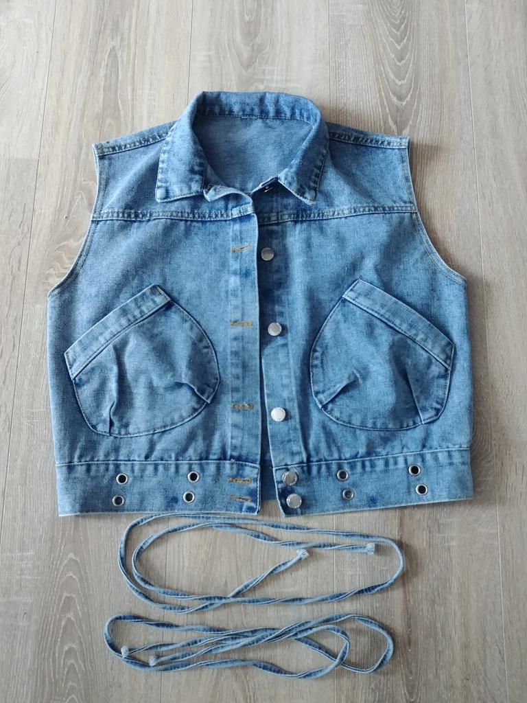 Мягкая джинсовая ткань, с запахом, пришлось стирать .В груди Ог 104 подошла свободно, а в талии нет... придётся в расстегнутом виде носить. Завязки по бокам жестковаты,после стирки торчат. В целом жилет такой смотрится неплохо.